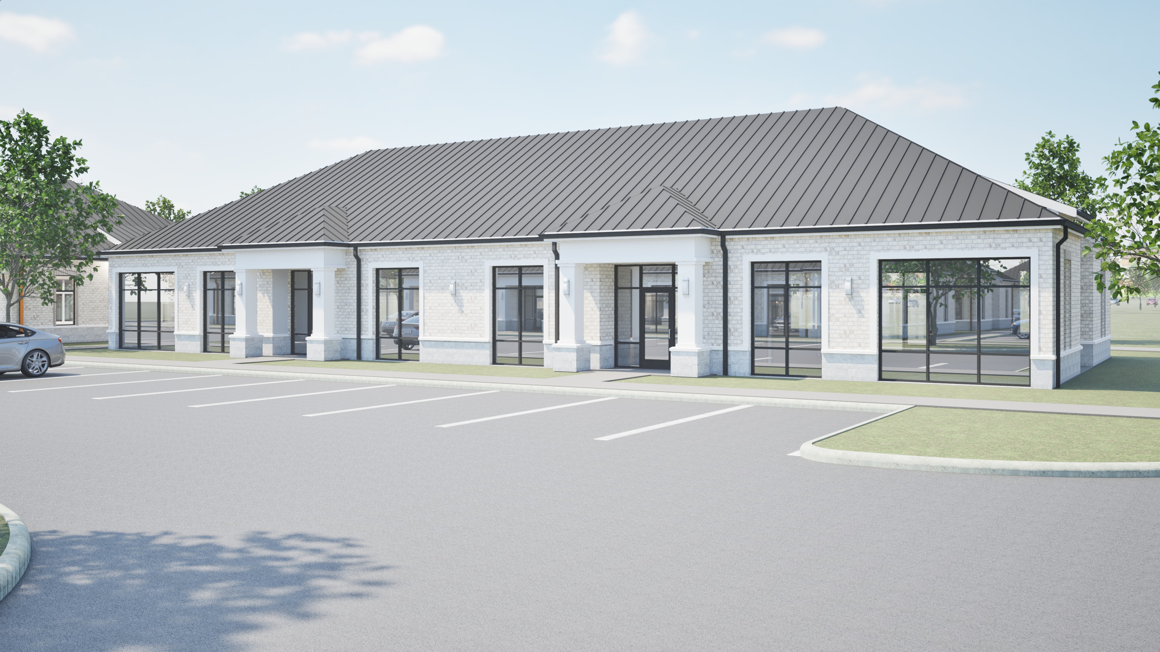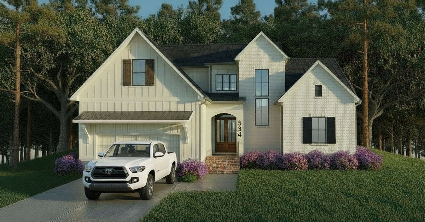 make as photorealistic as possible while keeping textures the same as selection professional landscaping with good lighting current material style just enhance all standing seam metal roof and stone veneer base
