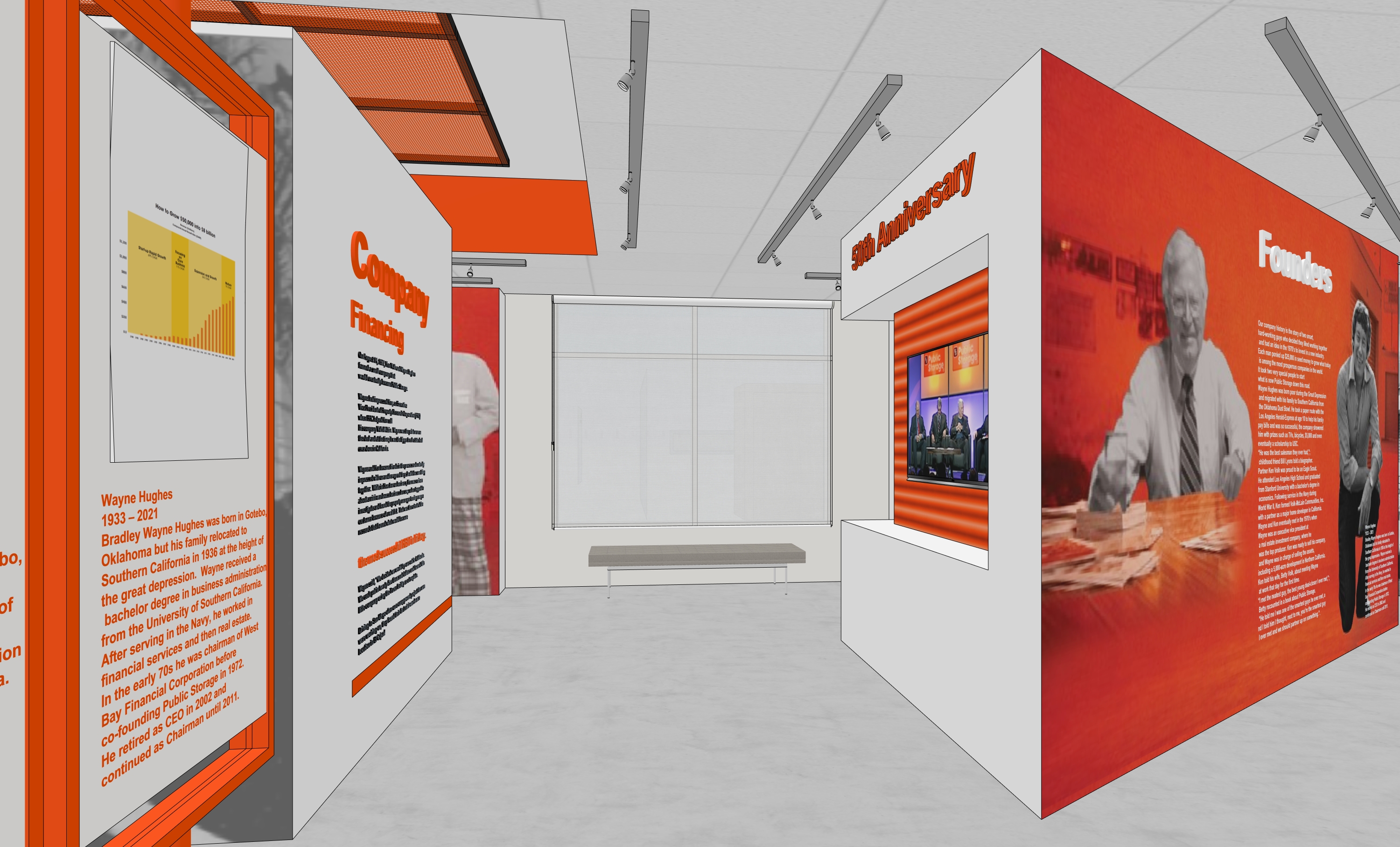photorealistic interior polished concrete floors white walls and light metal orange finishes the space is lit up with soft ceiling soft lights bright lighting and overall environment is soft bright lighting window view is parking lot with trees in day light perforated orange metal ceiling panels on left side with soft glow orange