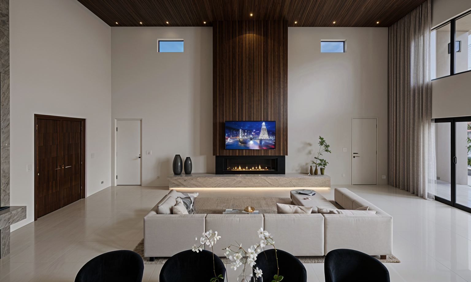 exterior shot monumental specialty coffee flagship in riyadh deep timber clt portal with continuous soft radius arch recalling colombian coffee houses white microcement walls thermally modified wood ribs as structure subtle pixel gradient colors inside ribs inspired by balcony balusters frameless recessed glazing desert noon light low angle 18mm hyper clean plaza photoreal ar 16 9 stylize 110 chaos 8 no hotel lobby revolving doors symbols chandeliers
