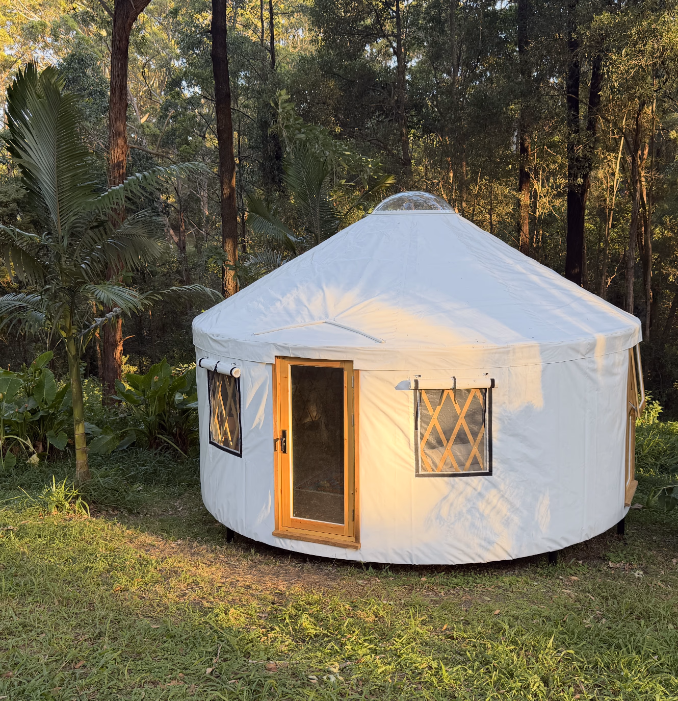 this is a 5m yurt create an image with a 7m yurt of the same style make the dome skylight proportionally bigger but not as balooned out so it baloons out as much as the pitch of the rafters make the flyscreen windows much larger make the front door a double glass door place the yurt in a picturesque scene next to a river make the pvc colour of the outer layer light beige