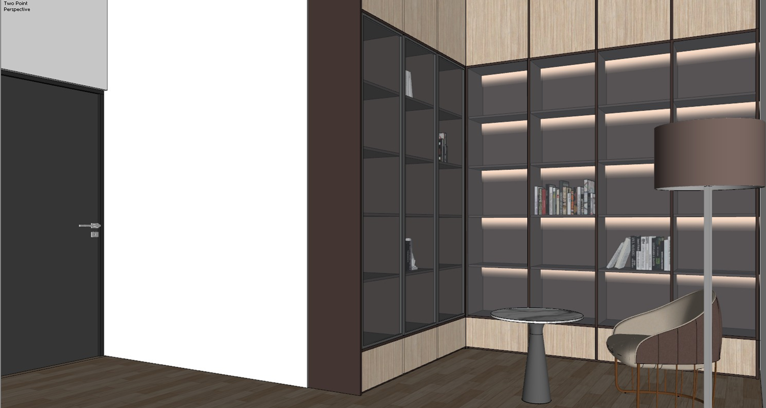 use the same material same colour same mood and make it realistic and detailed folllow same as previous render the left side is a a mirror cabinet i meant the left side of the study area cabinet is covered by a glass