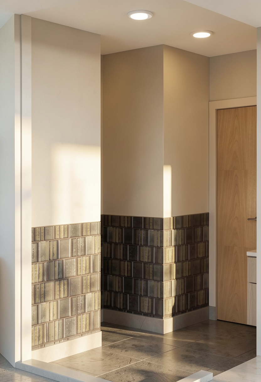 enhanced interior lighting white quartz slab shower wall and tub deck same white quartz slab on shower half wall on right side of shower brass deck mount tub filler on left porcelain undermount tub in tub deck on left small mosaic limestone tile on floor tan plaster on walls natural medium brown wood tall baseboard natural medium brown wood window trim and window cladding on left windows light window cladding with no frame for small windows in shower brass shower controls and 2 brass shower heads on right shower wall natural medium brown wood door on right with same wood frame and large header