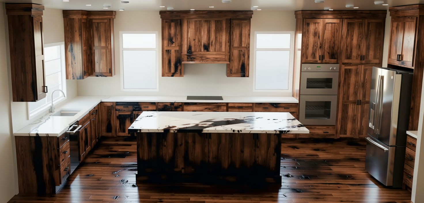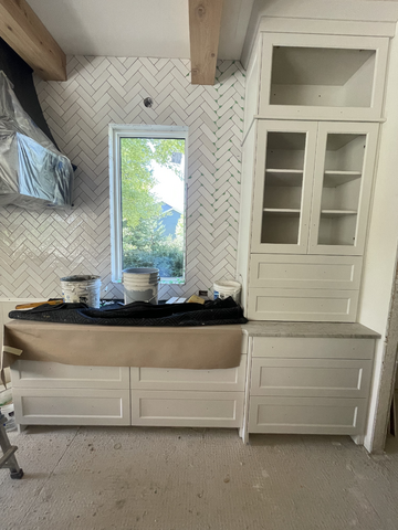 do not change the cabinets in any way preserve the exact cabinet colors materials finishes dimensions door and drawer styles hardware spacing alignment and all geometry exactly as shown do not alter the countertop shape backsplash appliances flooring lighting fixtures or wall structure only remove the construction materials clutter and mess from the scene clean the room and make it look finished and staged add a few simple tasteful home accessories appropriate for the style of the space but do not add or remove any furniture windows or architectural elements maintain the original lighting direction and realism enhance clarity and polish the photo while keeping the cabinetry and room design completely unchanged do not alter the lighting to keep the cabinet colors as they are in the image add new flooring and countertop add clear glass to the cabinet doors add gold cabinet pulls to all of the door and drawer fronts stage the countertop and glass cabinets for a beautiful luxury country kitchen