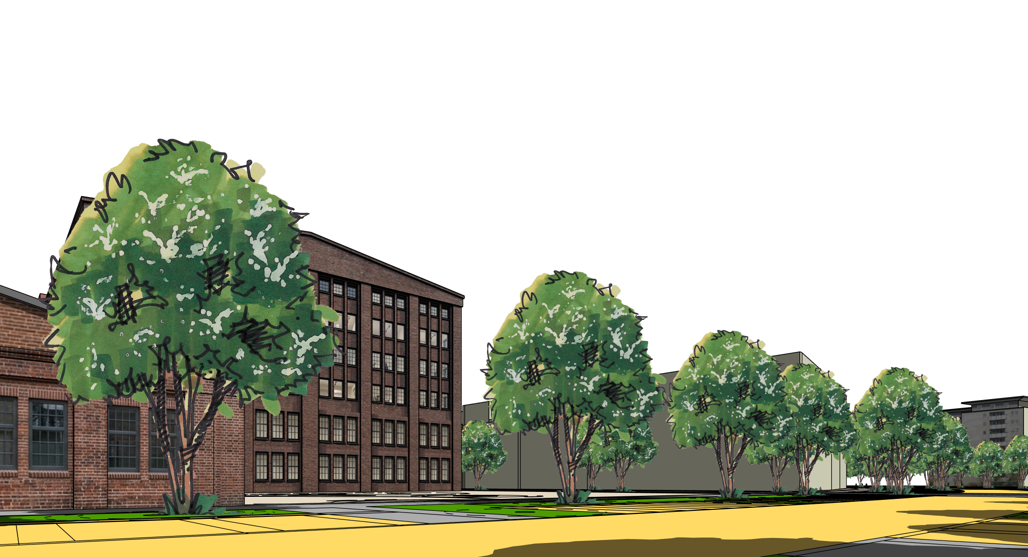 modernist exterior shot a vibrant urban scene with a row of buildings made of deep brick red featuring large dark windows the foreground has a series of lush green trees with subtle white highlights on the leaves the pavement is a warm yellowish hue under a bright clear sky giving an atmosphere of a sunny afternoon the overall mood is inviting and lively architecture