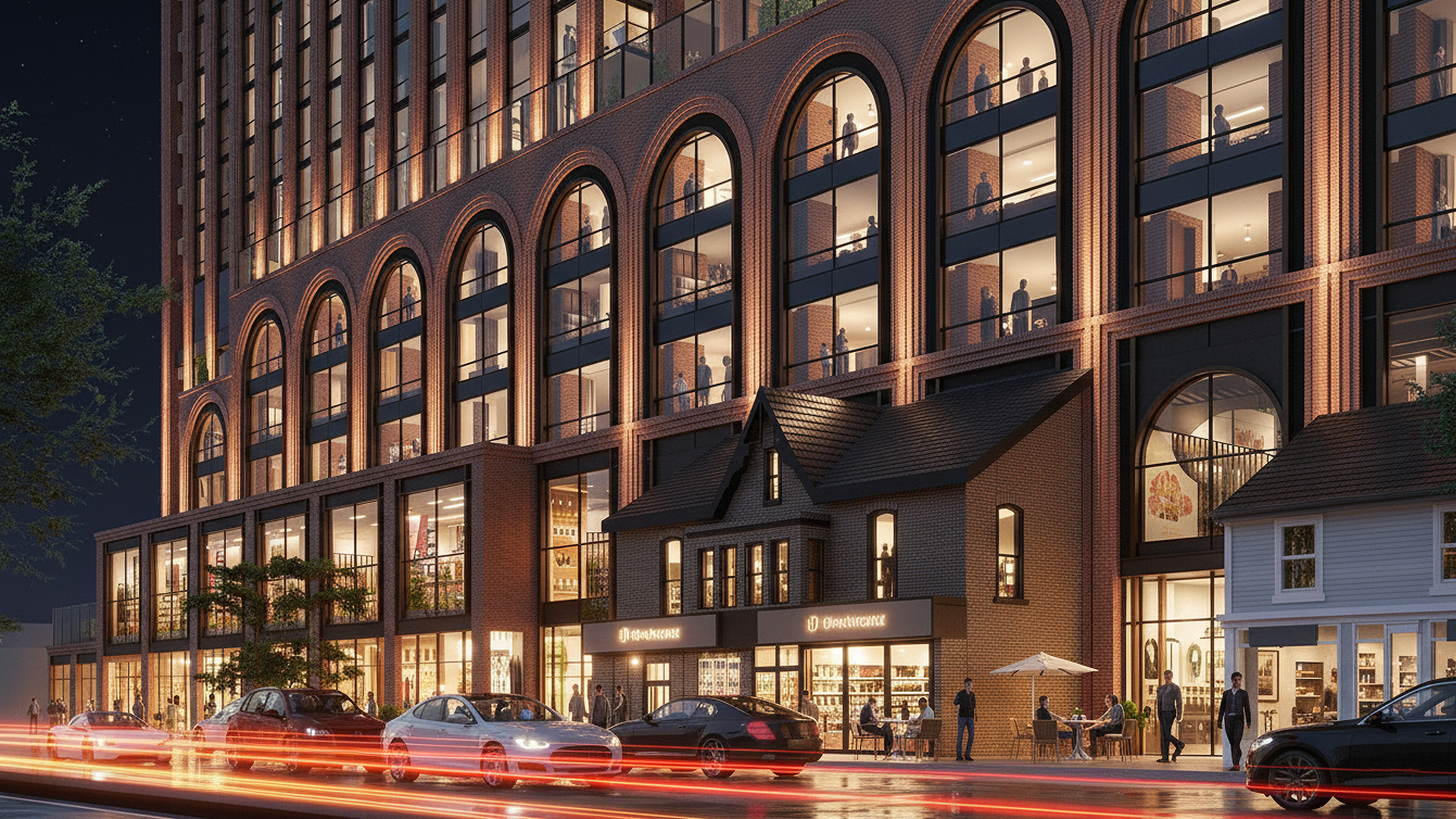 create a marketing style rendering with real materials add landscape throughout and on the podium terrace