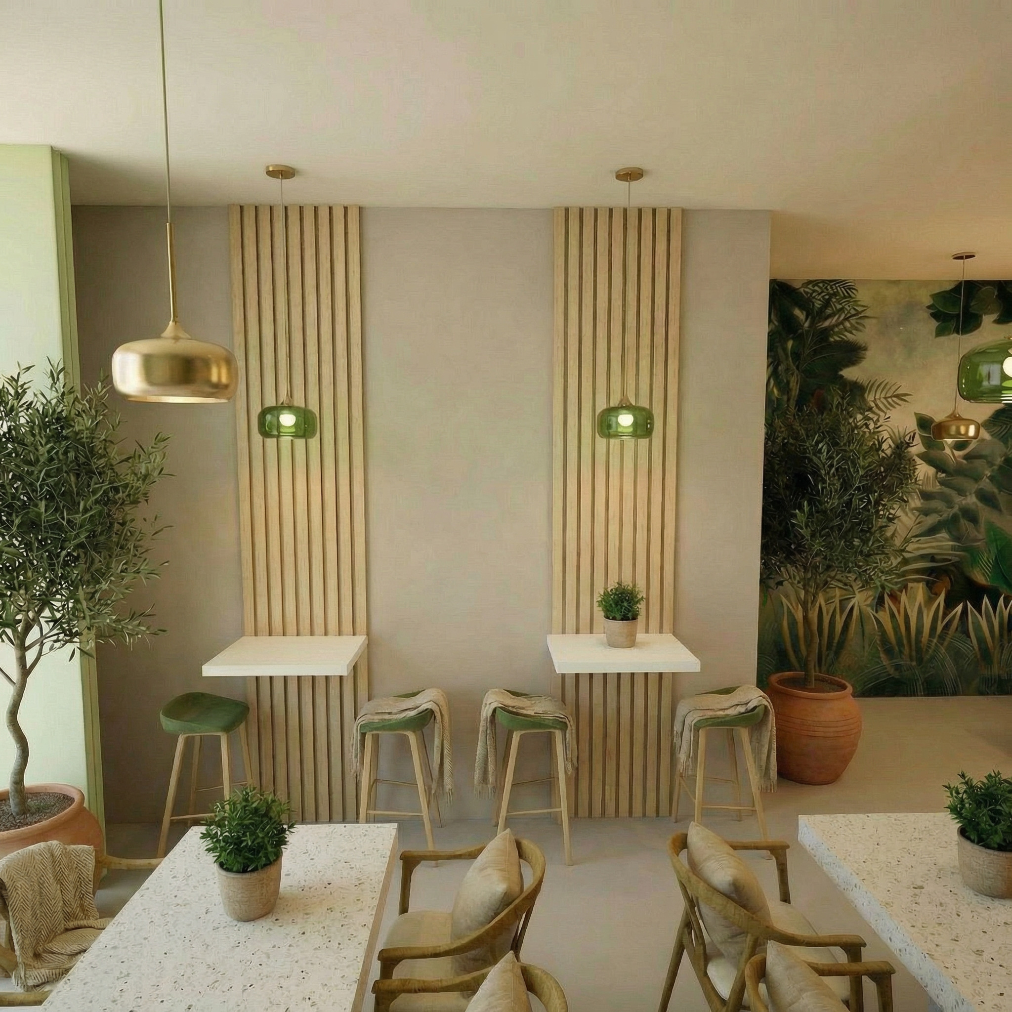 it transformed the white surfaces into beautiful tables with light gray cement table top and wooden table base that match the rest of the decoration