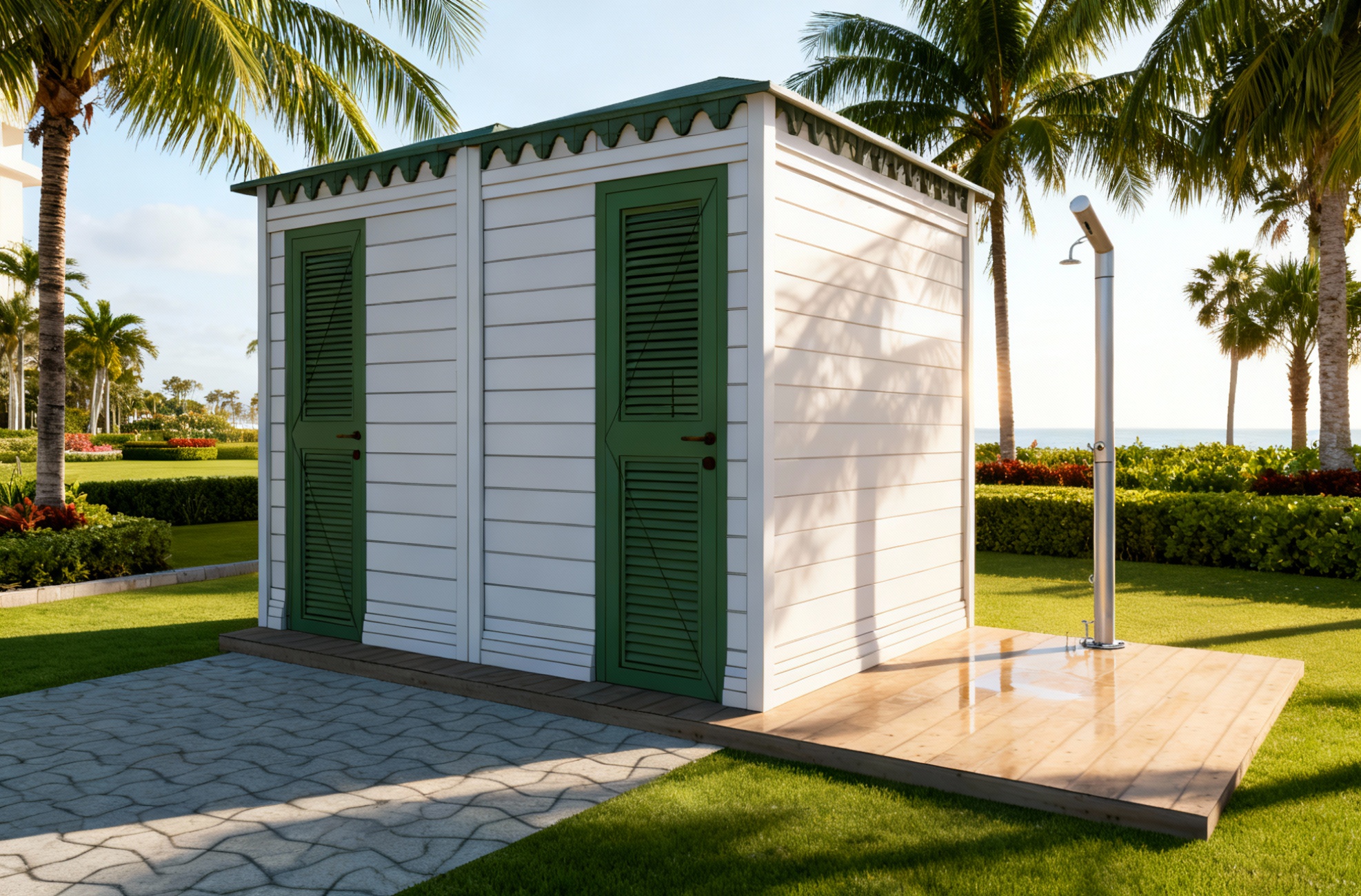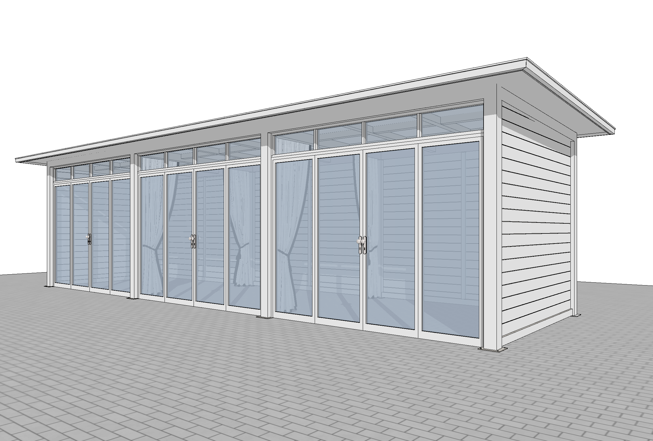 ultra photorealistic render of the exact cabana structure shown in the reference model do not change or modify any geometry proportions glazing layout siding door frames mullions roof shape hardware or the camera angle keep the model exactly as it is all exterior surfaces clean white color siding columns beams trims full height glass sliding doors with transom windows exactly as modeled with sheer curtains inside in the same arrangement place the cabana in a luxury west palm beach resort environment bright tropical daylight lush palm trees manicured lawns subtle resort buildings in the far background clean paver flooring under the cabana realistic glass reflections and shadows no design changes only photorealistic rendering and high end environmental context hyper realism crisp edges perfect exposure