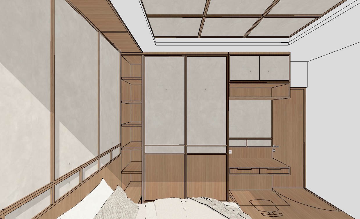 create an ultra realistic image from this jpg add ceiling spot lights use soft light wood textured to the floor and use warm off white for walls and the ceiling is white and add indirect light to the shelves add some decoration and add indirect light to the wood ceiling panel add soft outdoor light the wardrobe door using cream color