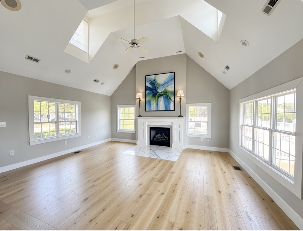 remove the wall art above the fireplace remove the two sconces above the fireplace remove the marble flooring section detail and match that flooring with the rest of the room change the floor color to a medium neutral brown wood 8in wide plank lvp