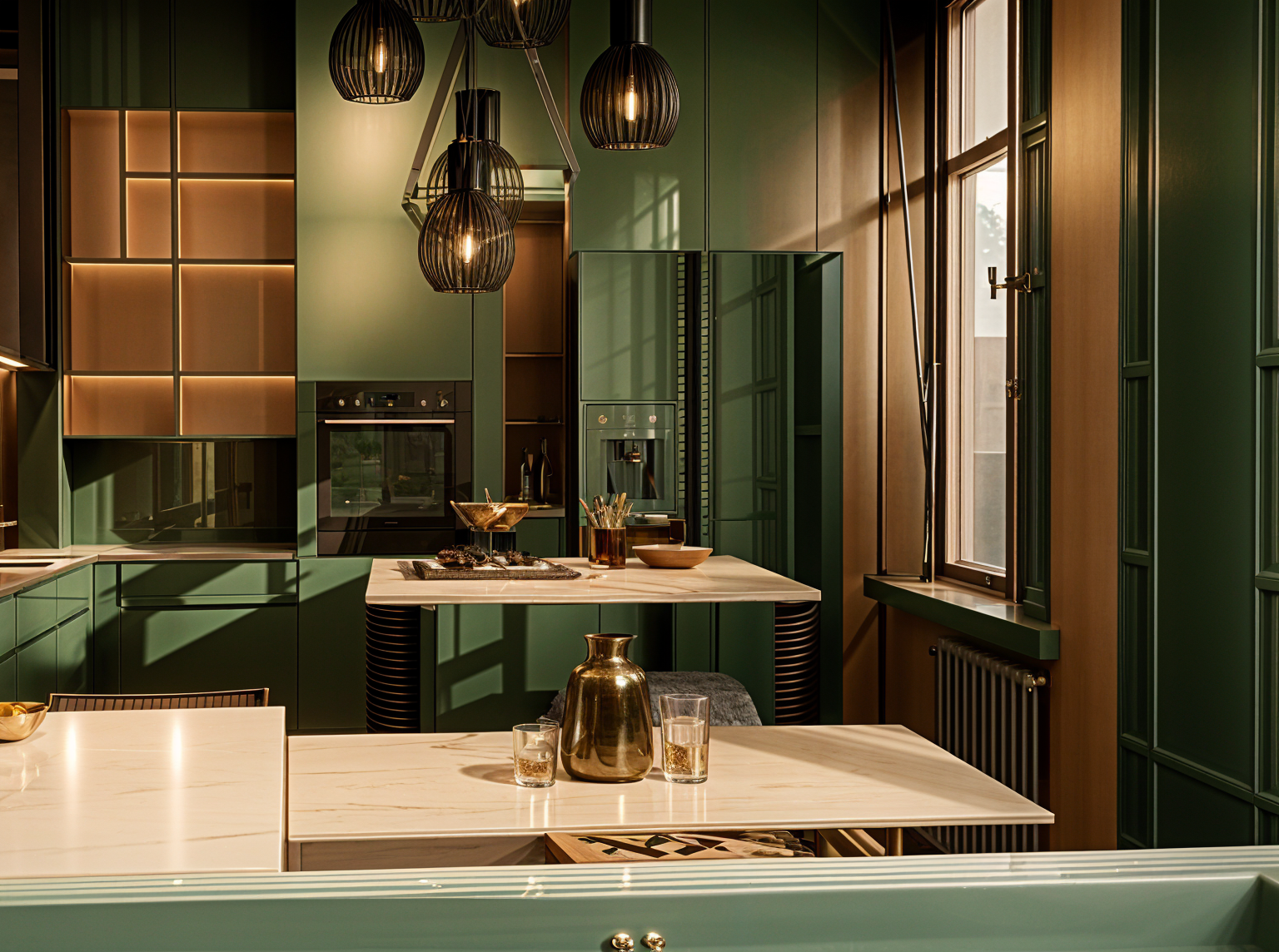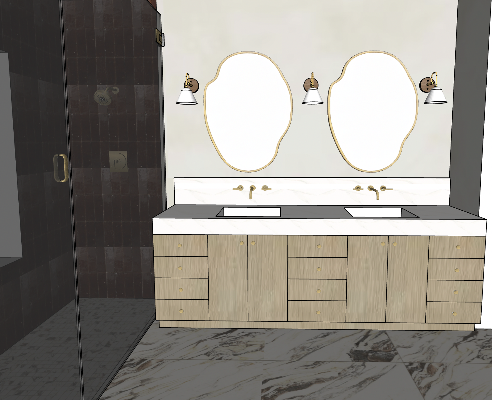 there is a window on the left wall in the shower so add natural light coming from the left and light from the wall sconces make the countertops more subtle veins