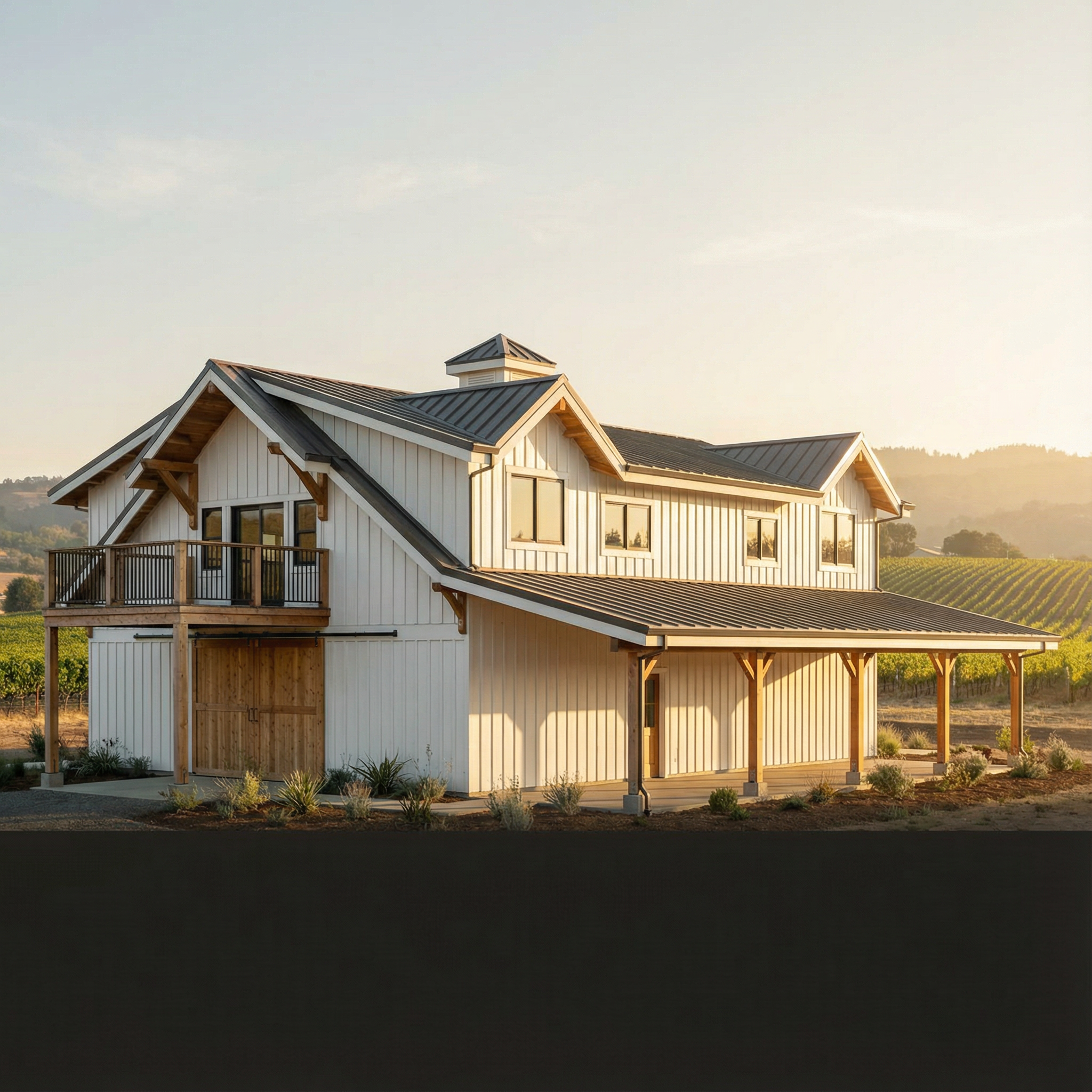 render the buildings in this image with soft textures the roofs are textured corrugated metal the walls are light wood like a cabin render the image so it architectural dimension overlay make it look like a technical sketch