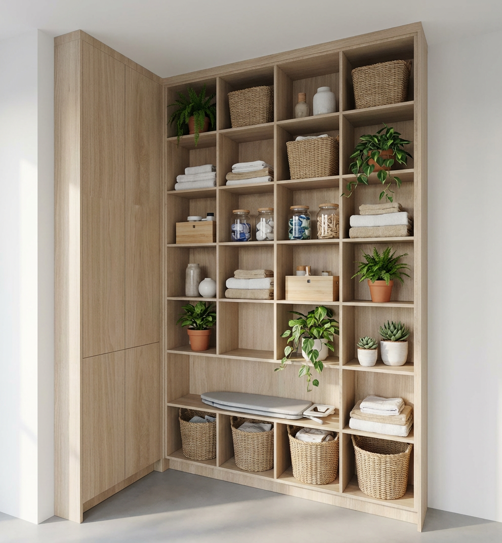 render a modern interior laundry and storage space with elegant cabinetry use light oak for the cabinetry decorate with household decors and some green pots natural light no led cabinet lights