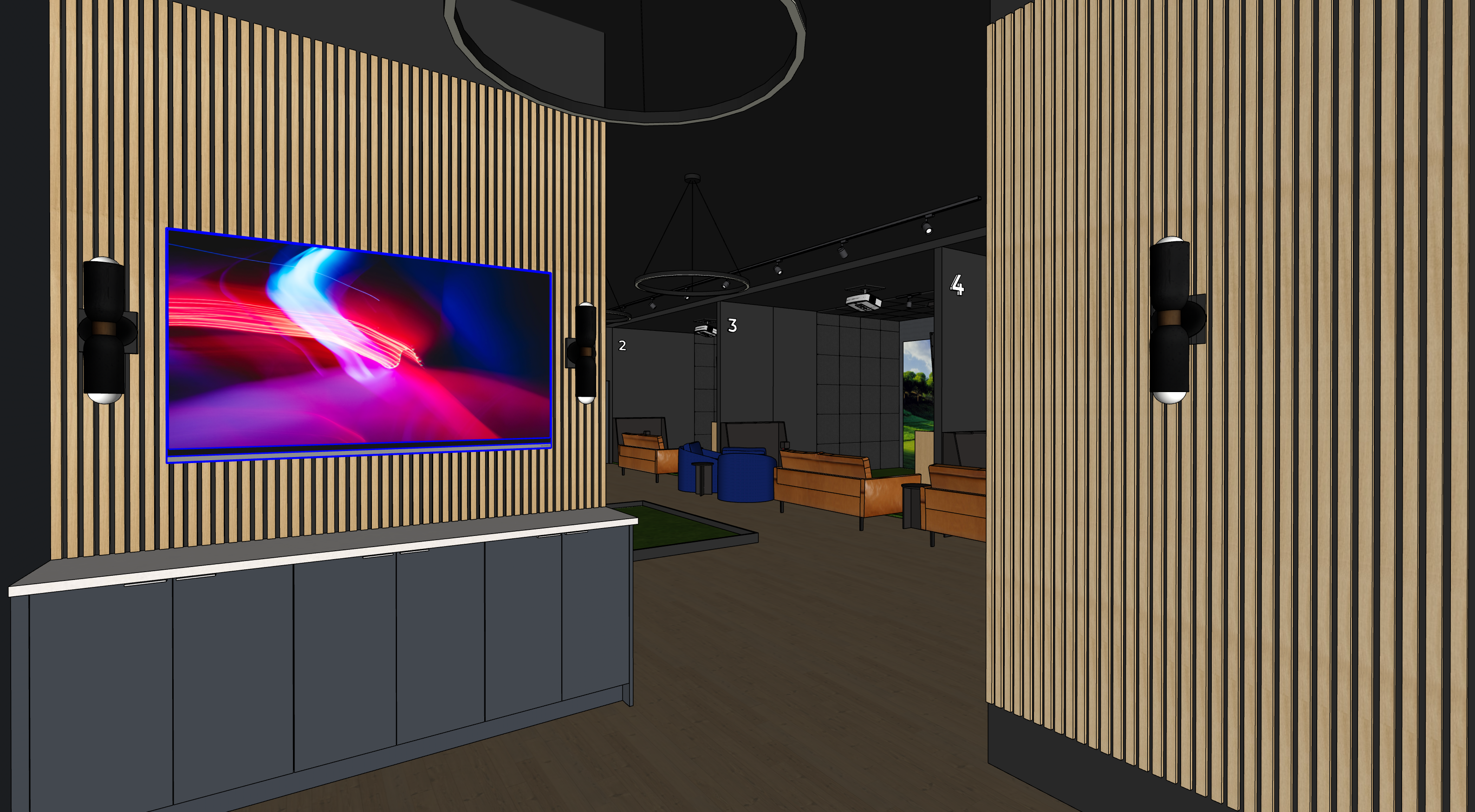 this image is an interior of an indoor golf lounge the numbers on the wall are back lit cabinets are dark navy blue with stainless steel cabinet edgepulls the round chandelier are modern led light chandelier