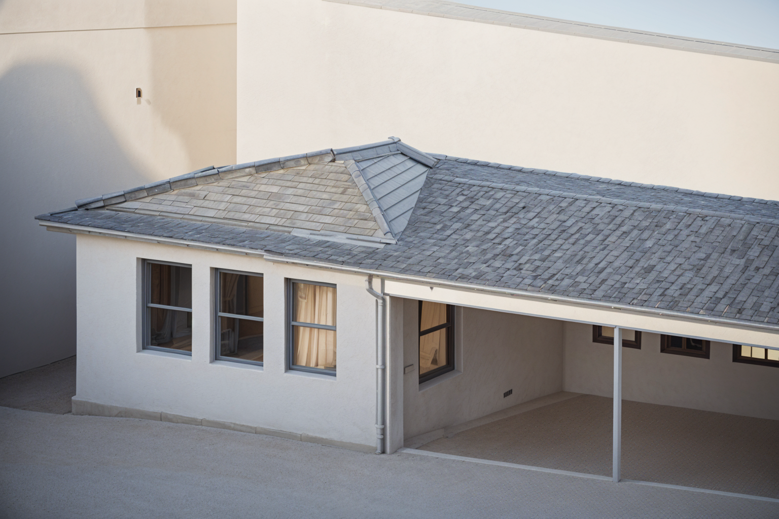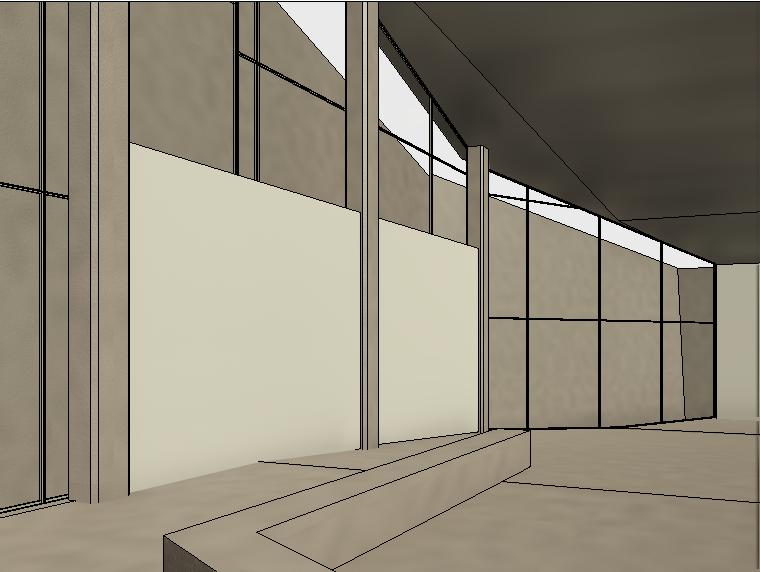 exterior shot render a modern architectural scene with tall windows and an open spacious interior use a serene and calming atmosphere with a color palette of soft beige for the walls light taupe for the floor and warm cream for the panels incorporate soft natural lighting from the windows casting gentle shadows across the space the ceiling should be a deep charcoal gray to enhance the modern feel the textures should be smooth and polished creating an elegant and inviting environment