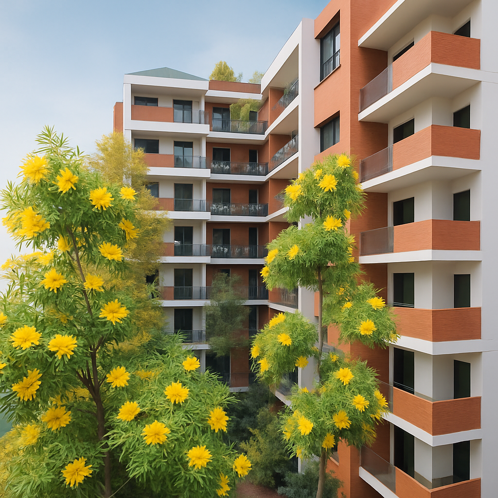 richard rogers exterior shot a modern apartment building with warm terracotta and white exterior featuring sleek balconies and large windows surrounding the building vibrant green trees with bright yellow flowers add a lively touch the sky is clear and blue creating a serene and inviting atmosphere the perspective should highlight the harmonious blend of architecture and nature architecture