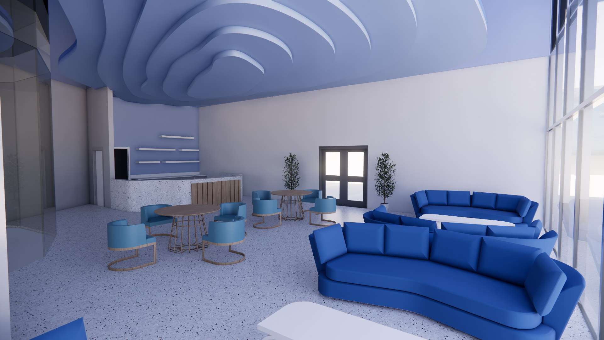 render this cafe realistic add less plants the ceiling is blue and the small chairs are a dusty blue