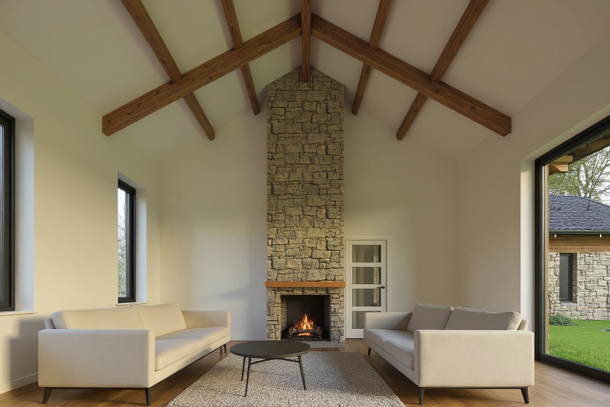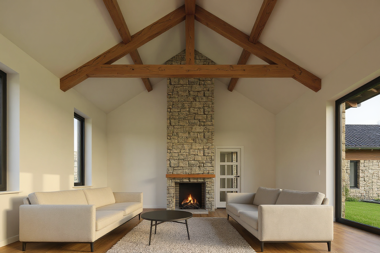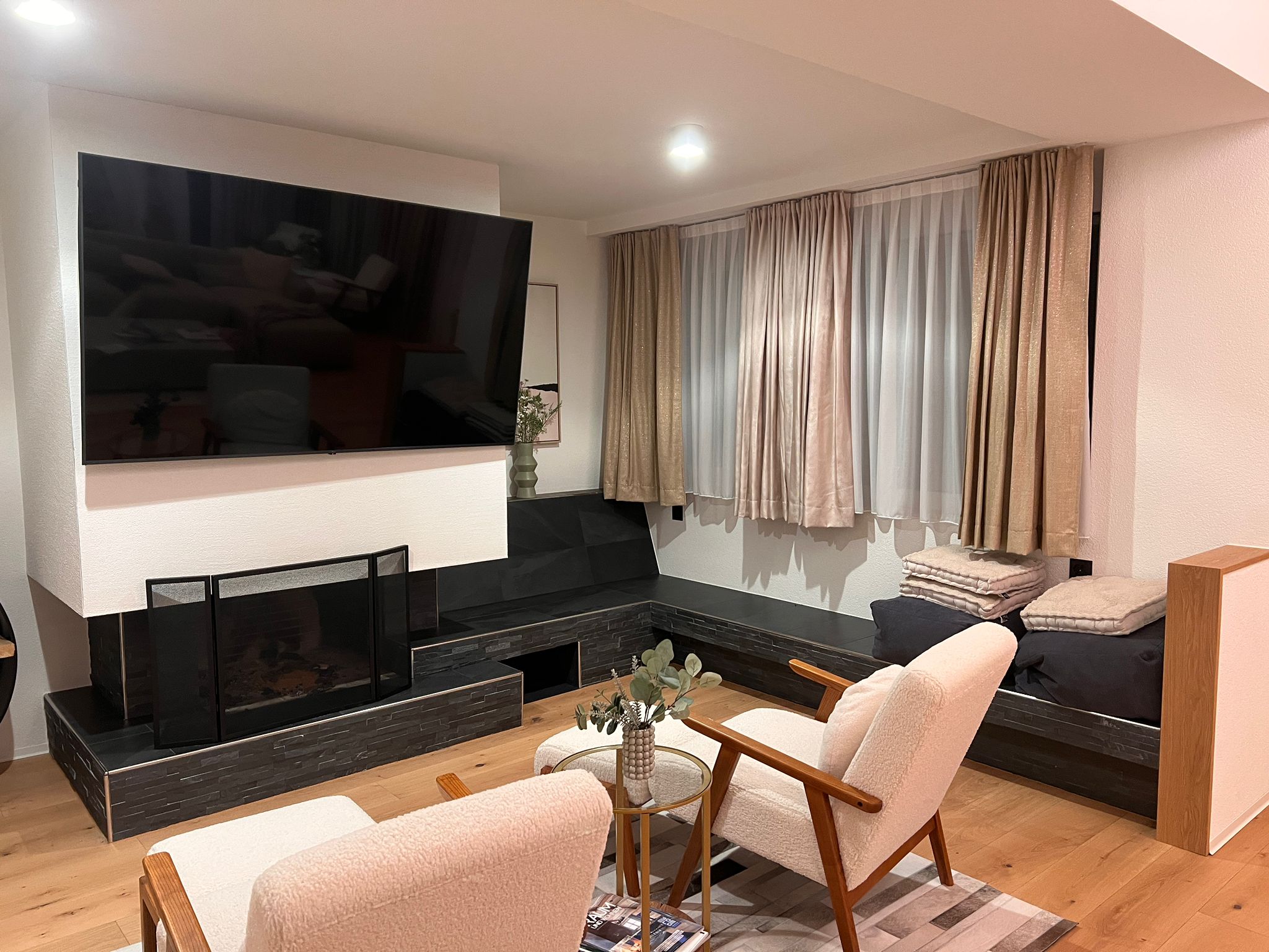 transform the tv wall into a clean elegant pure white architectural surface to create a bright upscale focal point replace all lower dark stone panels around the fireplace and along the bench with light matte beige or refined light stone slabs for a seamless modern luxury appearance add a subtle led light line running along the bench to enhance depth and atmosphere install a vertical indirect light cove beside the tv to introduce a sophisticated lighting accent place an elegant designer vase or premium decorative piece on the surfaces to elevate the visual style incorporate discreet gold or matte nickel accents for a refined tasteful touch upgrade the bench upholstery with high quality luxurious fabric in a soft warm tone ensure the entire space feels bright harmonious and luxurious with refined textures premium materials and modern architectural detailing