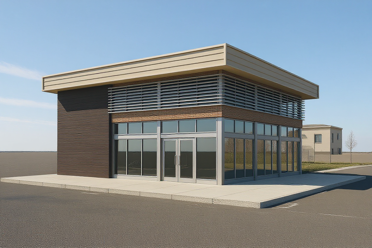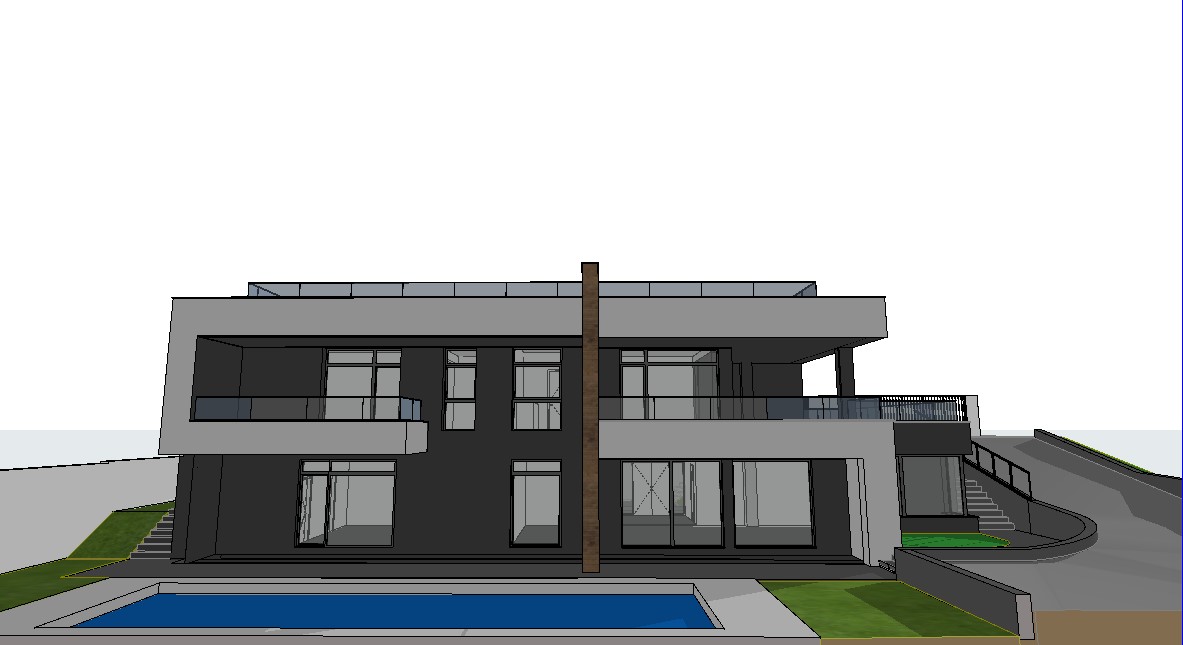 modernist exterior shot a beautifully rendered modern minimalist house set amidst a serene natural environment the house features angular wooden structures with a dark gray and black exterior large glass windows reflect the subtle hues of the surrounding landscape the wooden siding has warm earthy tones like soft browns and is combined with sleek contemporary black trimming the atmosphere is tranquil and the lighting is soft mimicking a gentle morning or late afternoon light the ground is adorned with patches of green moss and vivid yellow wildflowers adding a burst of color and life the surrounding trees are leafless drawn with delicate thin black lines indicating the late autumn season shadows of the trees create an intricate pattern on the house and the ground in varying shades of gray and brown the entire setting feels both modern and natural embracing simplicity and elegance architecture white facade keep windows from concept the background is forest please preserve the architecture and proportions of the building behind the building we have a slope and a forest
