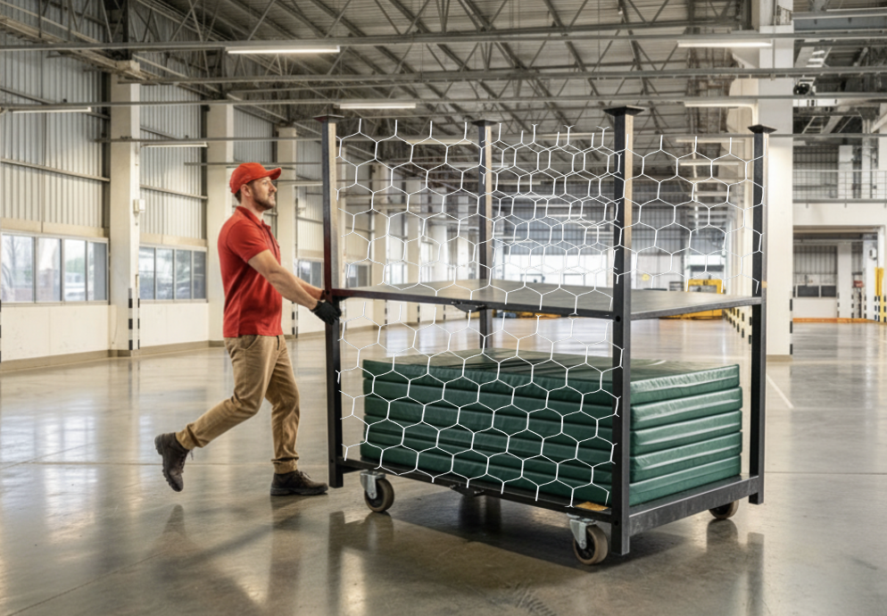 worker pushing an industrial rack with mattresses and a net that covers both horizontal sides of the rack from the bottom to the top