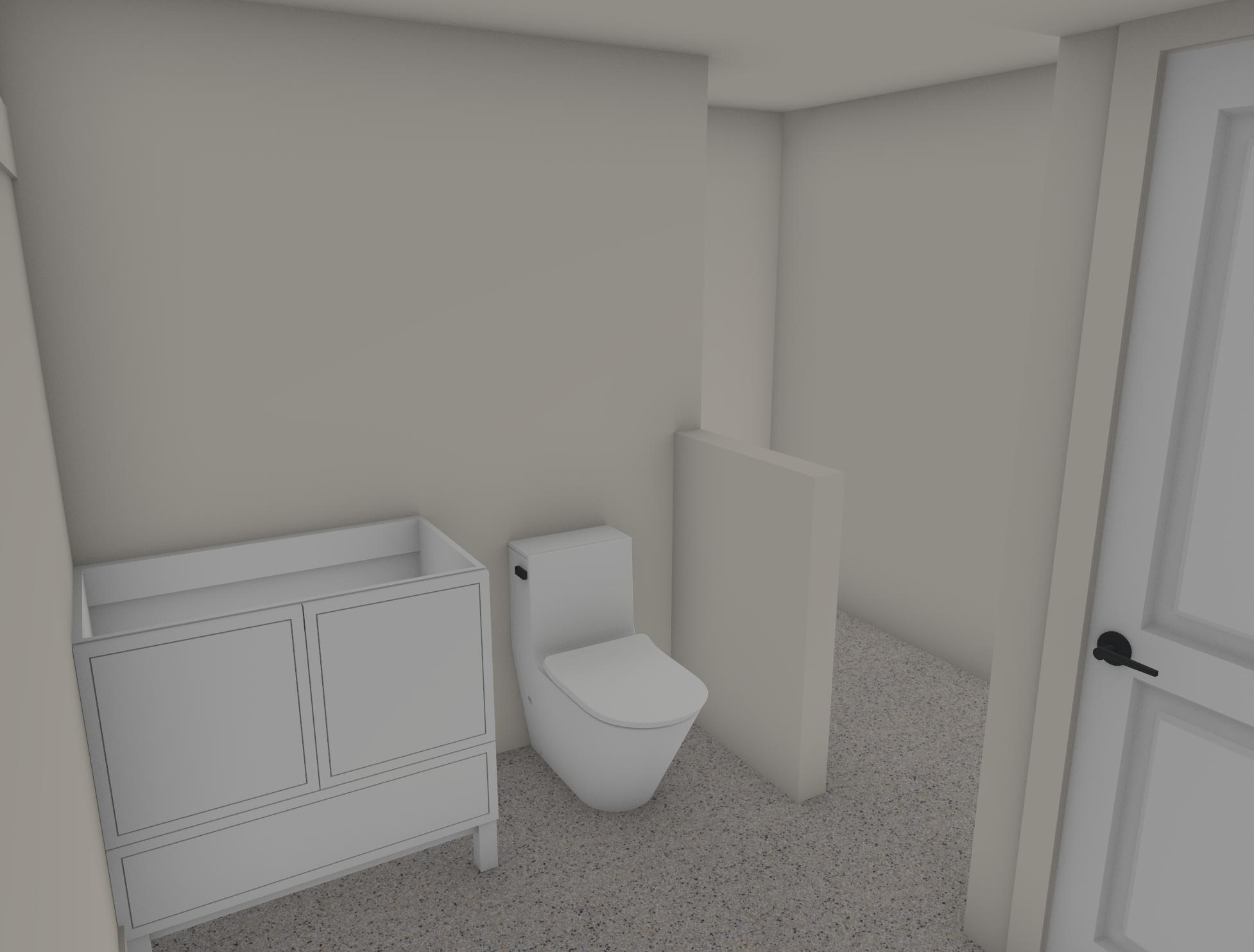 render this bathroom add a vanity top mirror with perimeter led light grasscloth wallpaper on the vanity toilet wall and shower on the top right corner with shower glass porcelain tile floor and shower fixtures including two rain showers