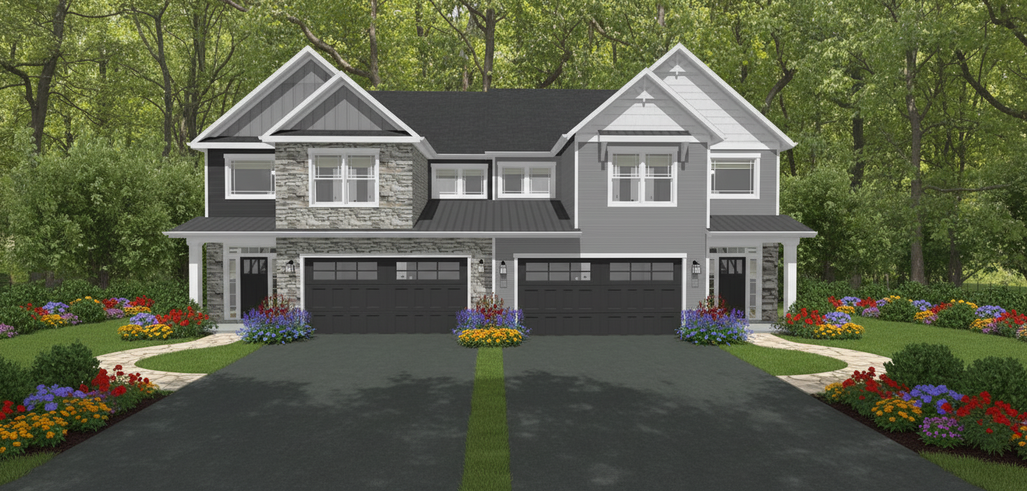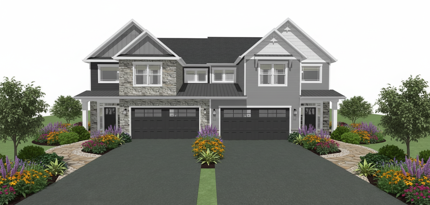 modernist exterior shot visualize a modern brutalist the structure should be concrete and steel atmosphere should be light and airy with clear blue skies and soft sunlight casting soft shadows the surrounding landscape should include lush green grass colorful flowering shrubs and tall deciduous trees with autumn colored leaves architecture don use stone