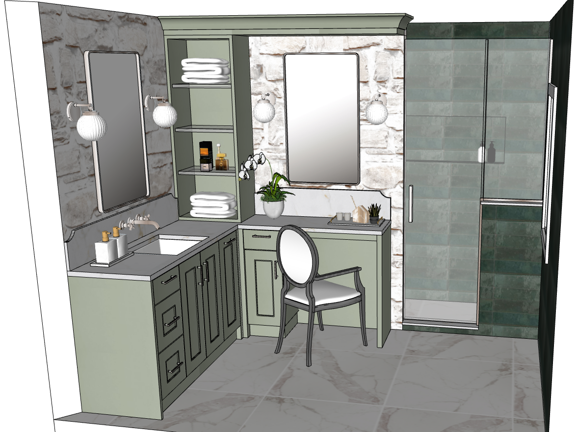 luxurious bathroom shiny emerald tiles in shower and right hand side wall with creamy cobblestone towards the white for the walls behind vanity lights coming out from the light fixtures sconces on the walls all the hardware plumbing around mirror and bases of sconces are polished nickel very light white marbley floors and counters white ceiling a recessed spotlight in the linen closet shining through the glass shelves where the towels are white ceiling clear shower door