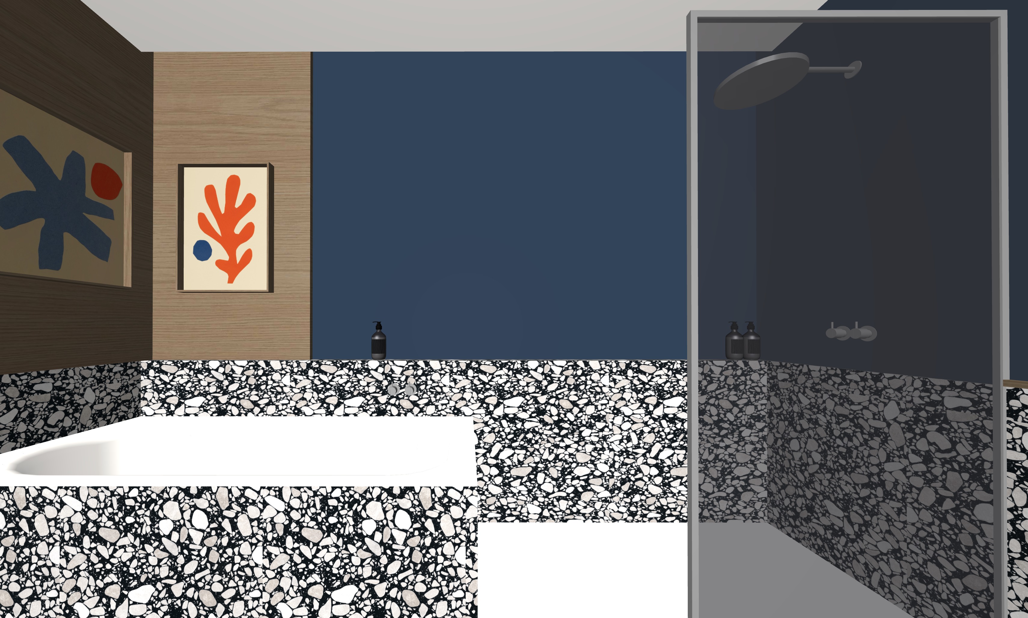 render a modern bathroom interior with a serene and stylish atmosphere include terrazzo surfaces with black and white speckled patterns the bathtub is embedded in these terrazzo surfaces feature dark blue walls for a sophisticated contrast incorporate warm wood paneling on one wall for texture highlighting minimalist artistic prints in bold red and blue hues add a glass shower enclosure with a subtle sheen equipped with sleek chrome fixtures ensure all elements are harmoniously balanced in the soft ambient lighting