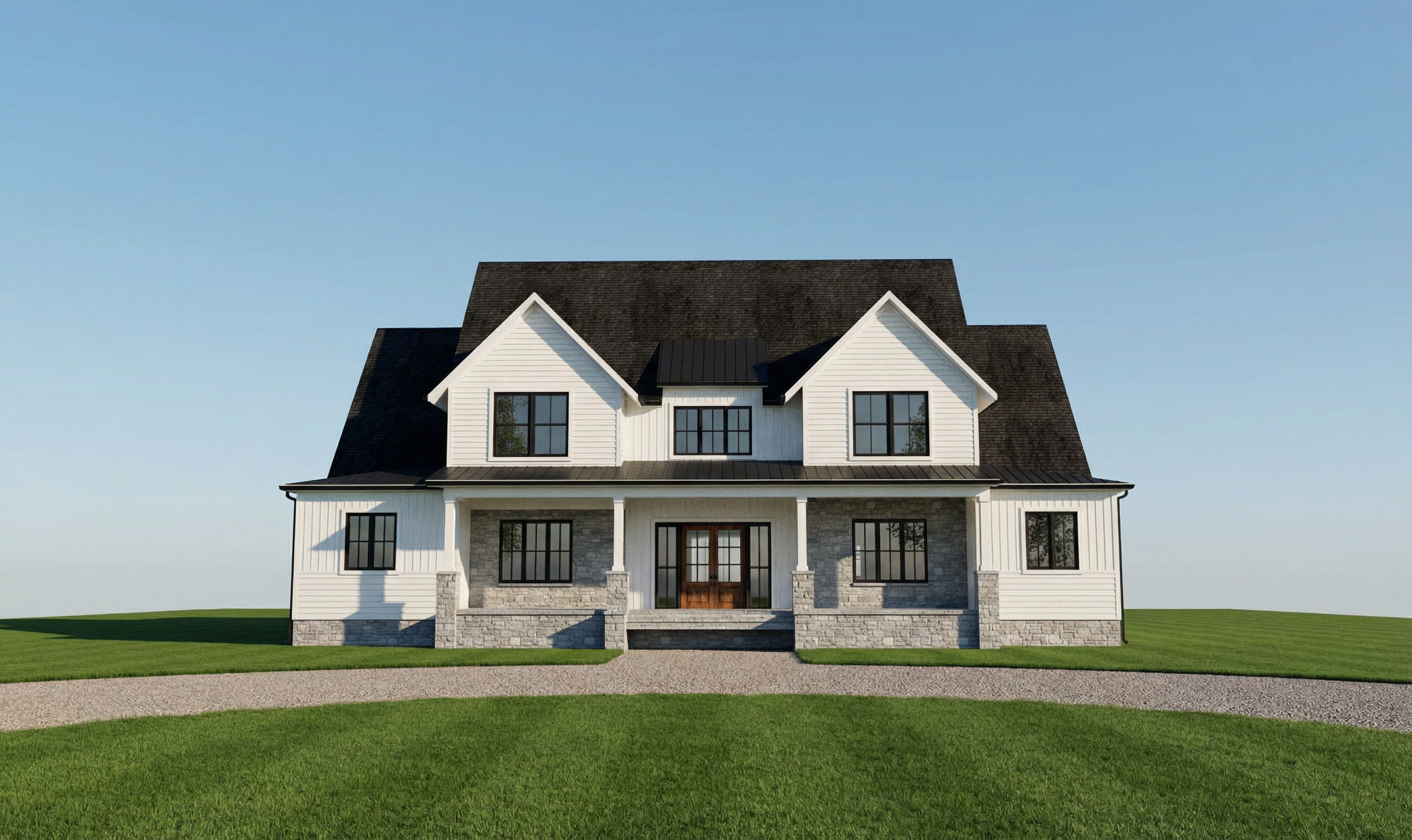 house sits on a small hill lot in a subdivisions white brick on foundation and facade sherwin williams drift of mist colored siding in the middle black metal roof on porches and shingles everywhere else white windows stained front door surrounded by mature native plants concrete driveway on right side