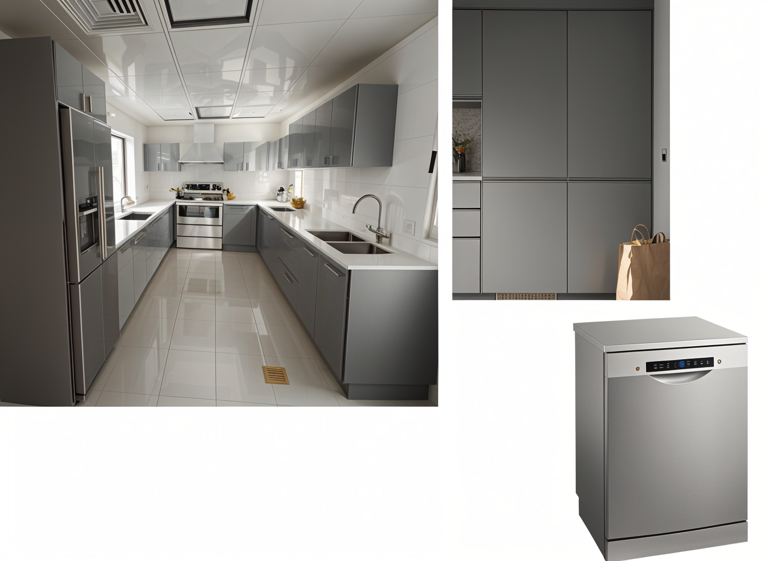 change the fronts to matte gray same like on the picture behind without hands change the fronts on fridge to matte gray same like on the picture behind place the dishwasher next to the sinks in the same row