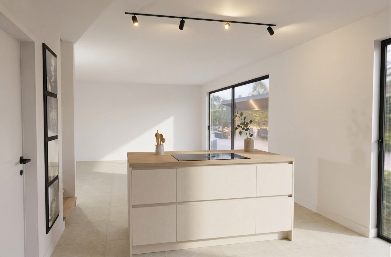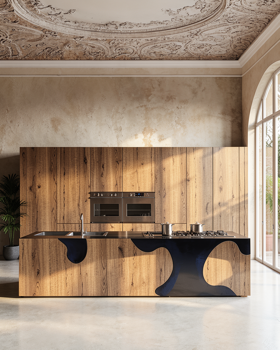 make the stove on the island with induction plate not with gass and remove ceiling make it more simpler like just plane white