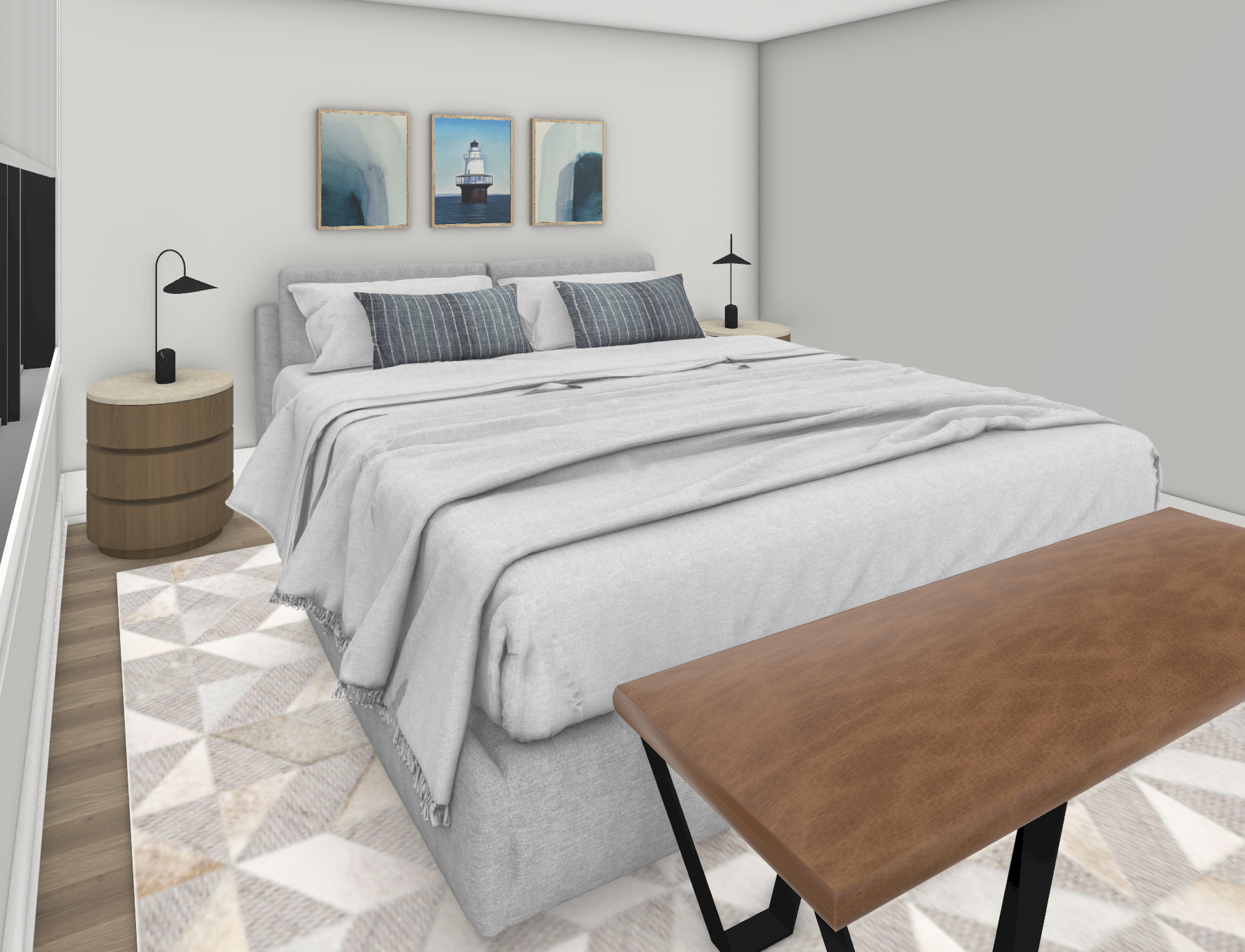 natural lighting add a few accessories to bench and nightstands preserve colors and textures add dark grey fabric curtains to windows