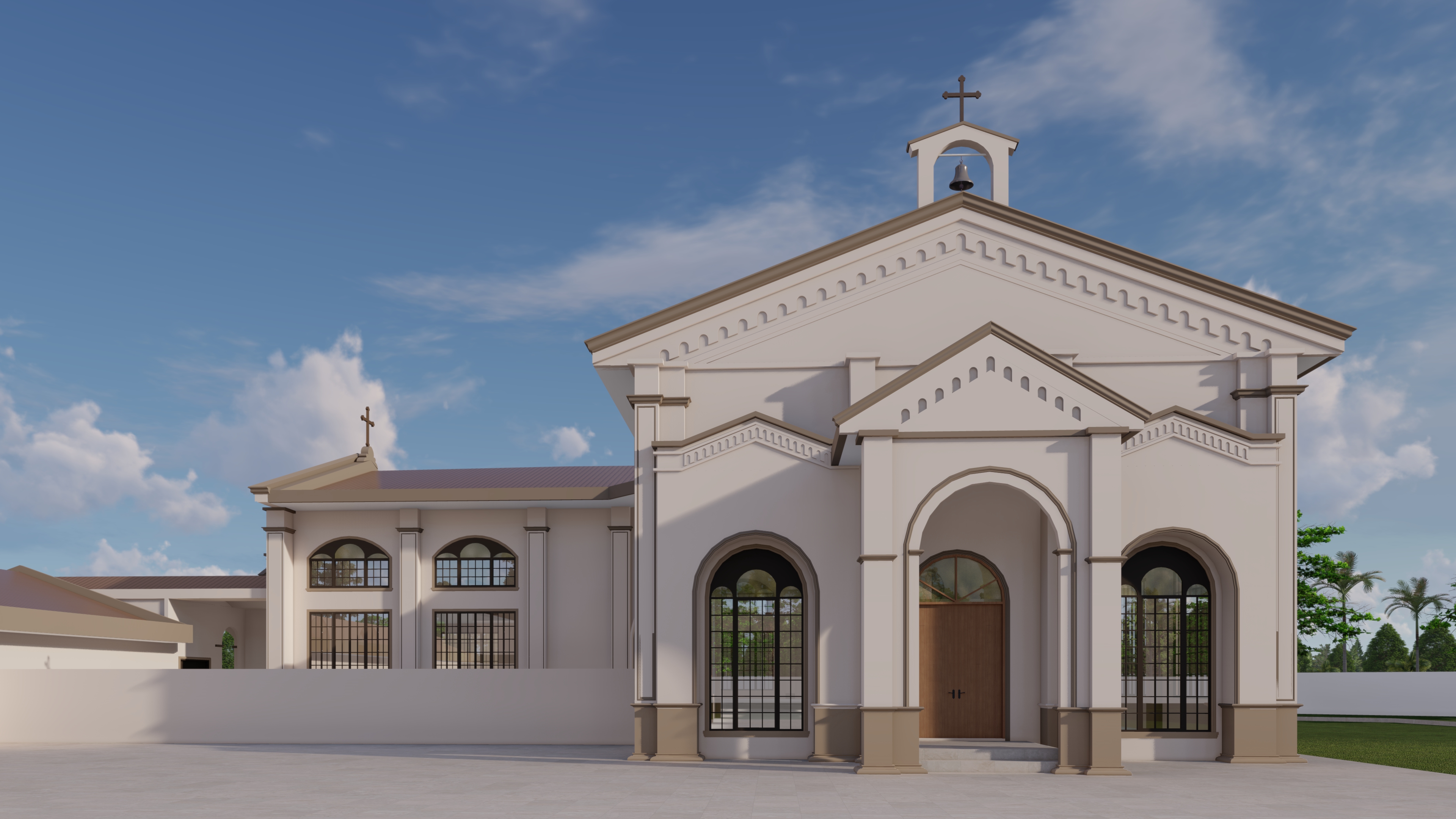 generate this reference image into a very realistic photo similar to a dslr camera photo with ultra hd resolution without changing the layout geometry and material textures in the reference image enhance the material texture in the image to be very realistic a serene chapel with a soft light illuminating the white and beige church walls the wooden doors should have a rich warm brown tone natural lighting without additional effects output ratio 16 9