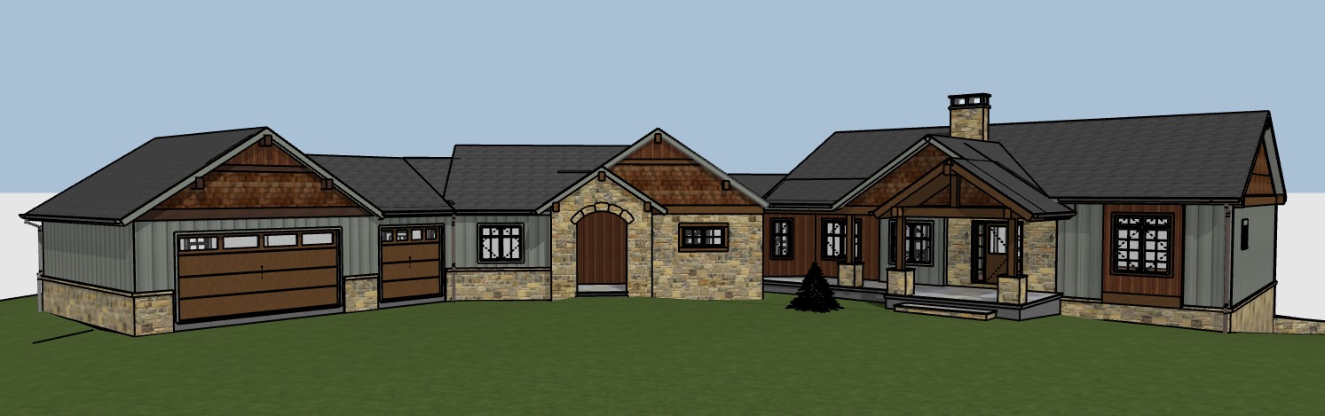 make photorealistic keeping architecture materials and colors the same adding light landscaping driveway walkway and low mountains in background