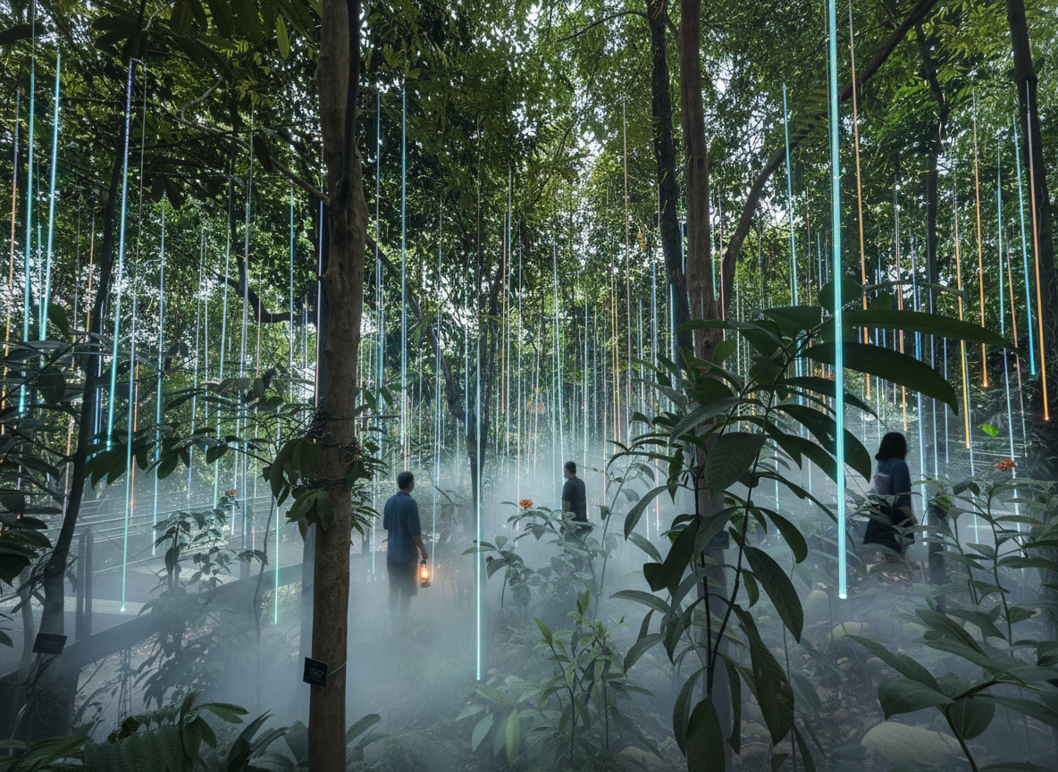 a render of a night installation at the singapore national orchid gardens light beams dart around the space pulsing from one place to another a firefly effect fills the space people move around holding oil lamps