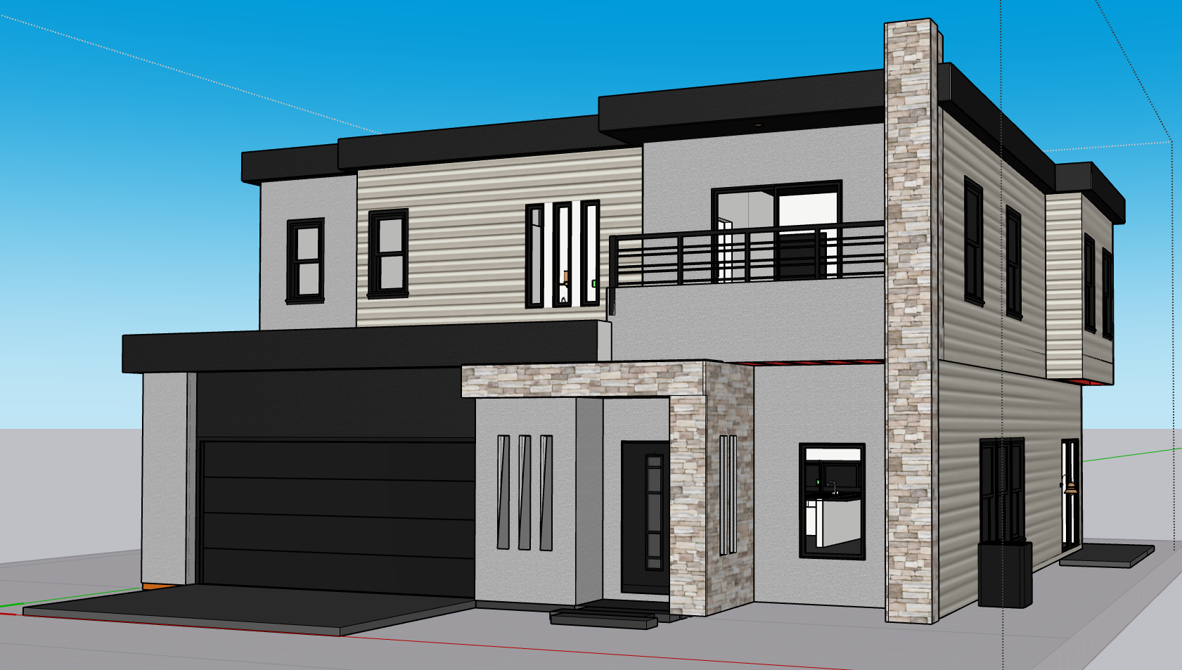 render this house keeping the exact original structure proportions and all existing pavement and driveway layout but apply the same architectural style materials and atmosphere as the reference image use a modern palette with matte black accents beige natural stone cladding and warm wood finishes under the eaves and around the entrance add large windows with black aluminum frames and elegant soft led exterior lighting the stone texture should look realistic similar to light limestone with natural variations the concrete at the entrance steps and driveway must remain in its original layout with a smooth clean finish that matches the overall design render the scene in daylight representing natural light around 3 45 p m central time in houston during winter with soft balanced brightness not a sunset allowing harmony between the landscape and the interior warm lighting visible through the windows the goal is a cozy realistic balance between indoor illumination and exterior natural light include modern low maintenance landscaping with clean grass minimal shrubs and black planters render with high realism natural reflections on the glass soft daylight shadows and a clear blue sky background negative prompt do not alter the structure window openings proportions or pavement layout do not add balconies railings or new extensions avoid sunset or night backgrounds harsh contrast overexposed lighting exaggerated vegetation or metallic reflections