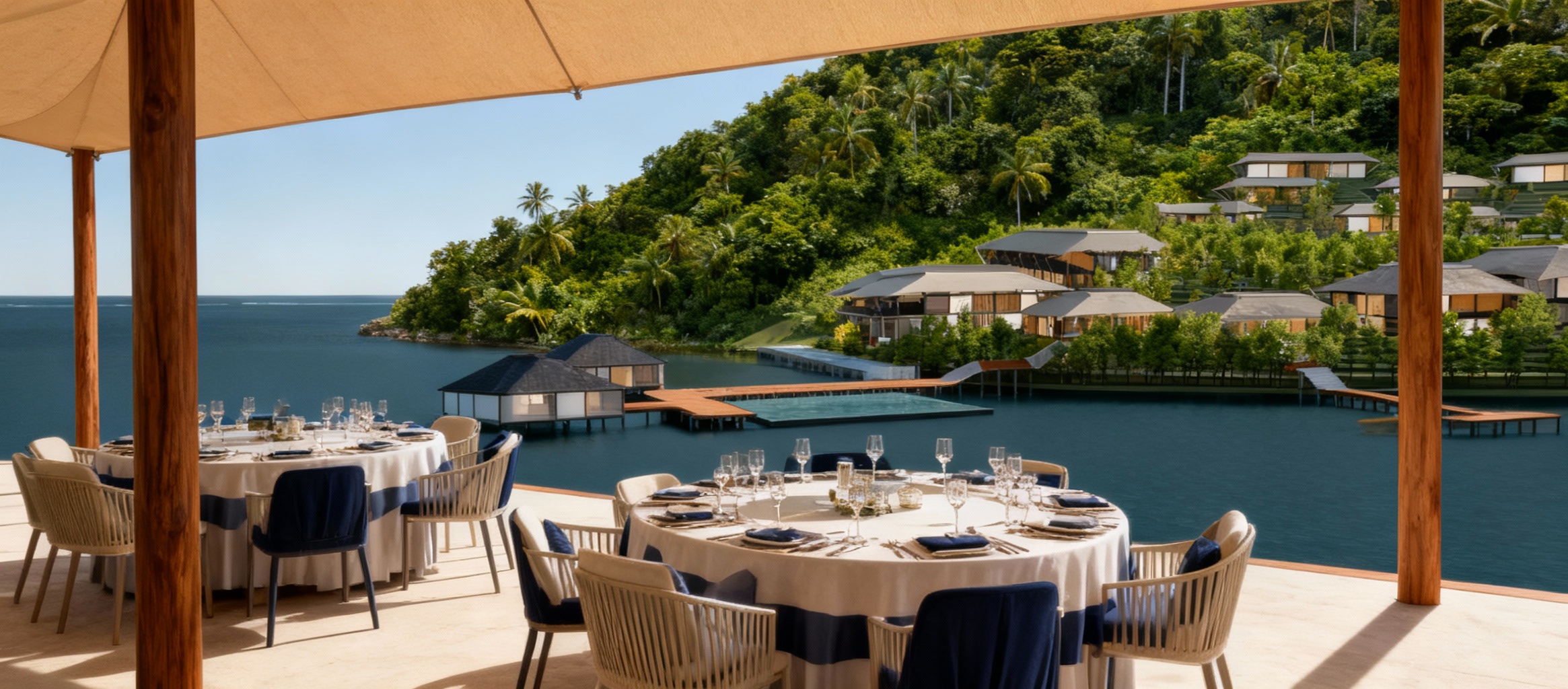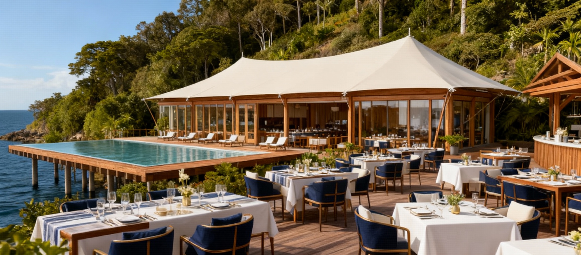 archsynth render based strictly on the exact angle and composition of the provided 3d drawing preserve all geometry and arrangement enhance material realism of the tent building light brown fabric roof wood structure stilt foundation and minimalist japanese inspired lines add dense forest vegetation on the hill behind without altering the original view keep the labuan bajo coastal atmosphere
