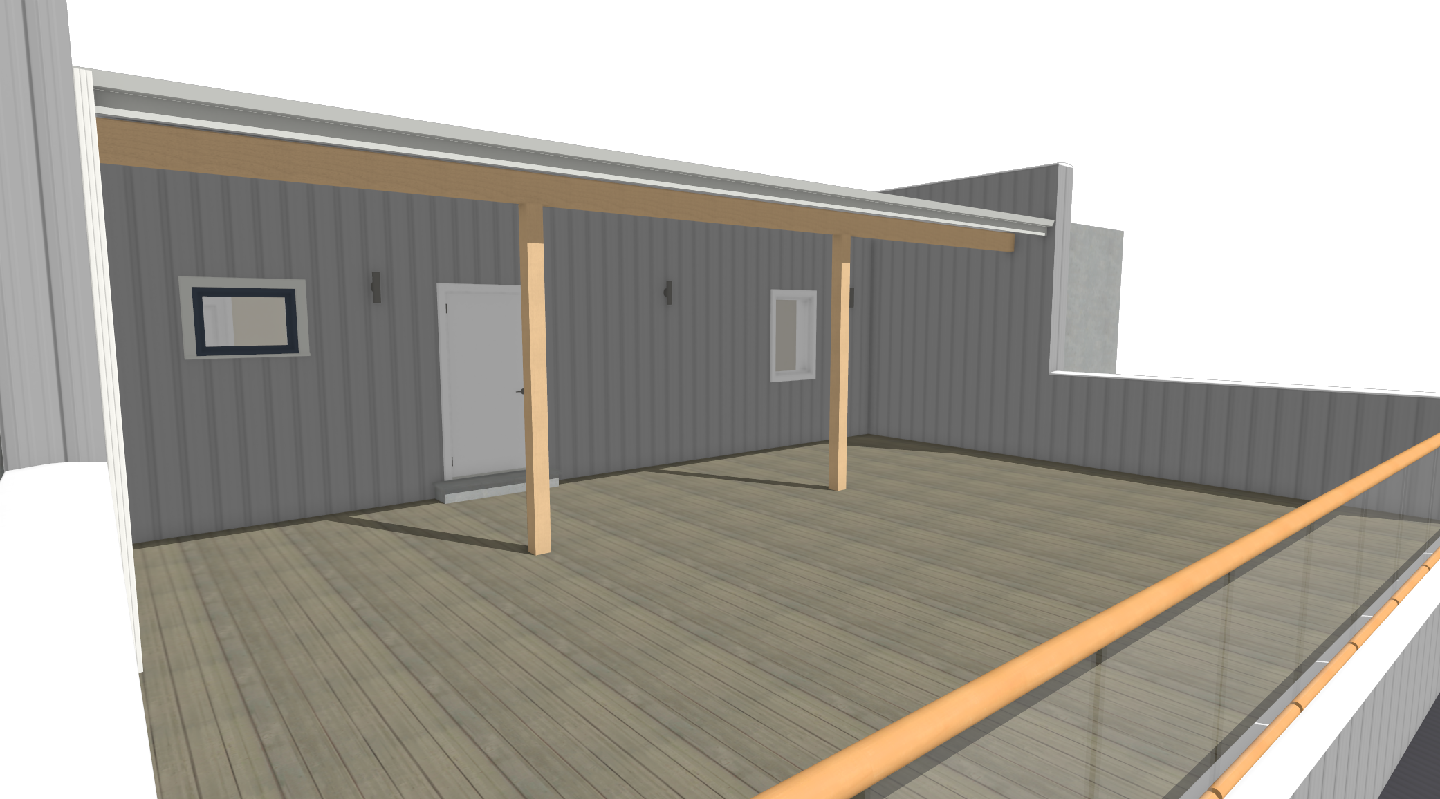 a stylish rooftop patio designed for comfort and versatility featuring a thoughtfully arranged selection of common outdoor furniture the space includes cozy lounge chairs a central coffee table and a dining set perfect for casual meals or entertaining guests neutral toned cushions add warmth and invite relaxation while durable materials ensure the furniture stands up to the elements the open layout allows for easy movement and socializing making it ideal for both quiet evenings and lively gatherings siding is a ribbed grey metal railing is glass and aluminum