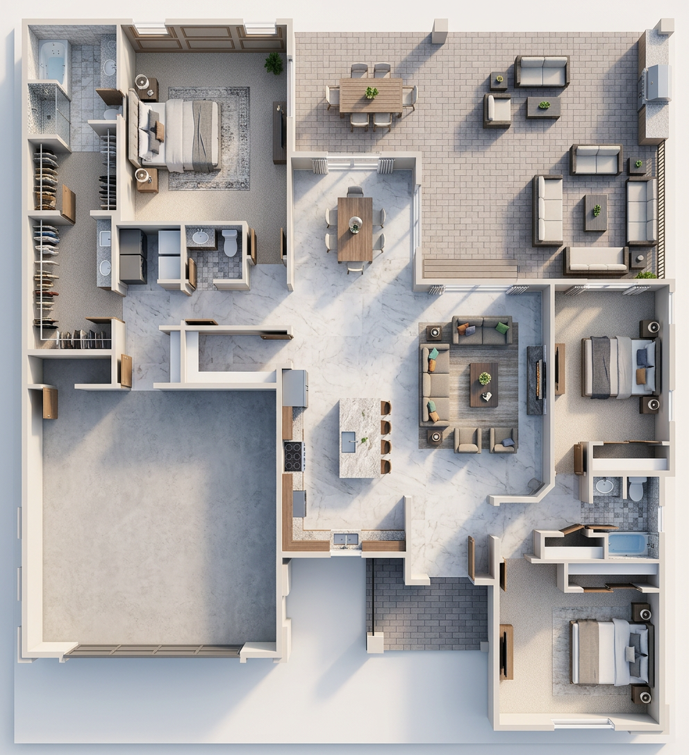 make this view look more realistic the ivory area is smooth eggshell warm white stucco and the timber is a light white oak wood plank installed vertically the window and door frames are dark anodized bronze and the roof is a dark charcoal aluminum standing seam roof make a blue sunny sky with a few clouds give soft shadows for dimension add a light concrete driveway with a few stucco planters that have bougainvillea blooms
