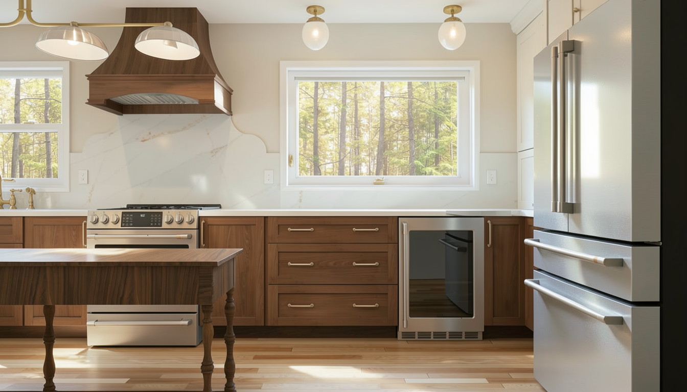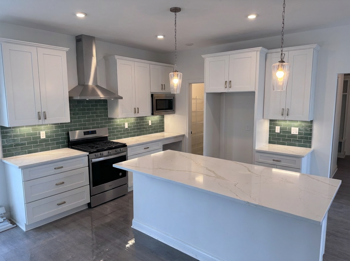 remove the extra trim pieces from left side of photo dry the laminate flooring make the subway tile darker green with a little bit of color variation make the cabinet pulls and lighting gold move the microwave down under the countertop and extend the upper cabinet down to match the others add a whirlpool stainless steel refrigerator add a stainless steel double bowl sink and a moen sleek pull down faucet in brushed gold in the island