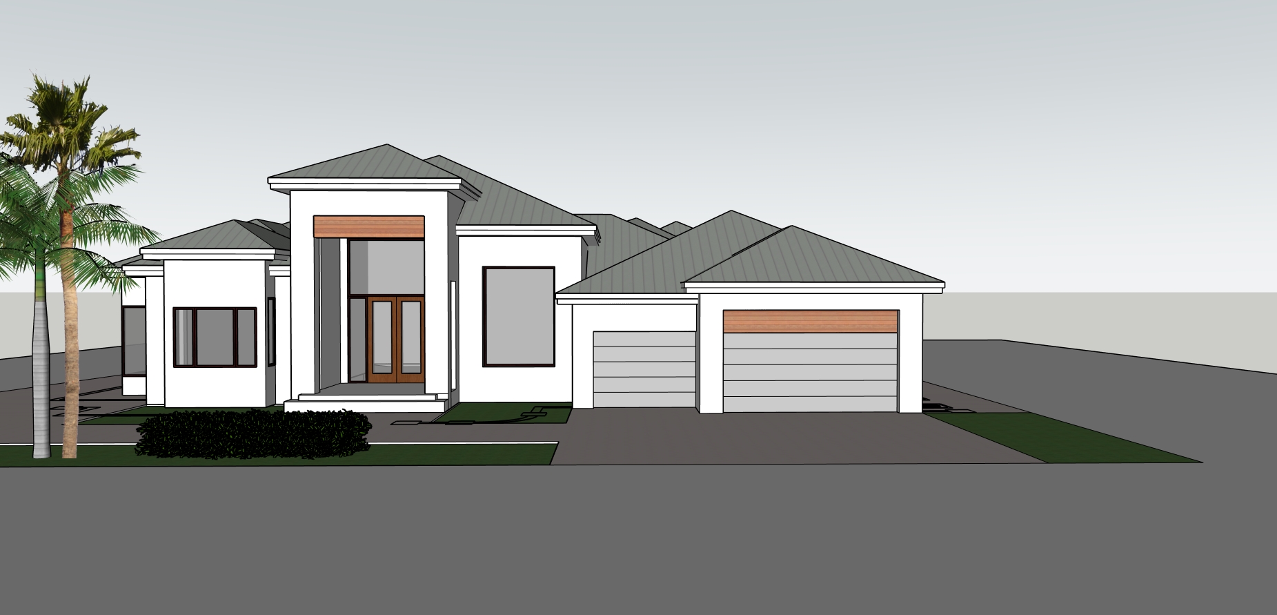 a florida modern house facade with a tropical ambiance create a realistic rendering of a contemporary house featuring white exterior with shades of darker gray for the roof incorporate large windows with sleek bronze frames keep original window frames the front door should have warm wood tones the garage door is gray and there is a horizontal wood accent above it and above the front entrance add lush green palm trees and bushes in the front yard with vibrant grass the sky is clear with a subtle gradient from light blue to soft white the overall atmosphere is tranquil and inviting bathed in soft natural sunlight keep geometry