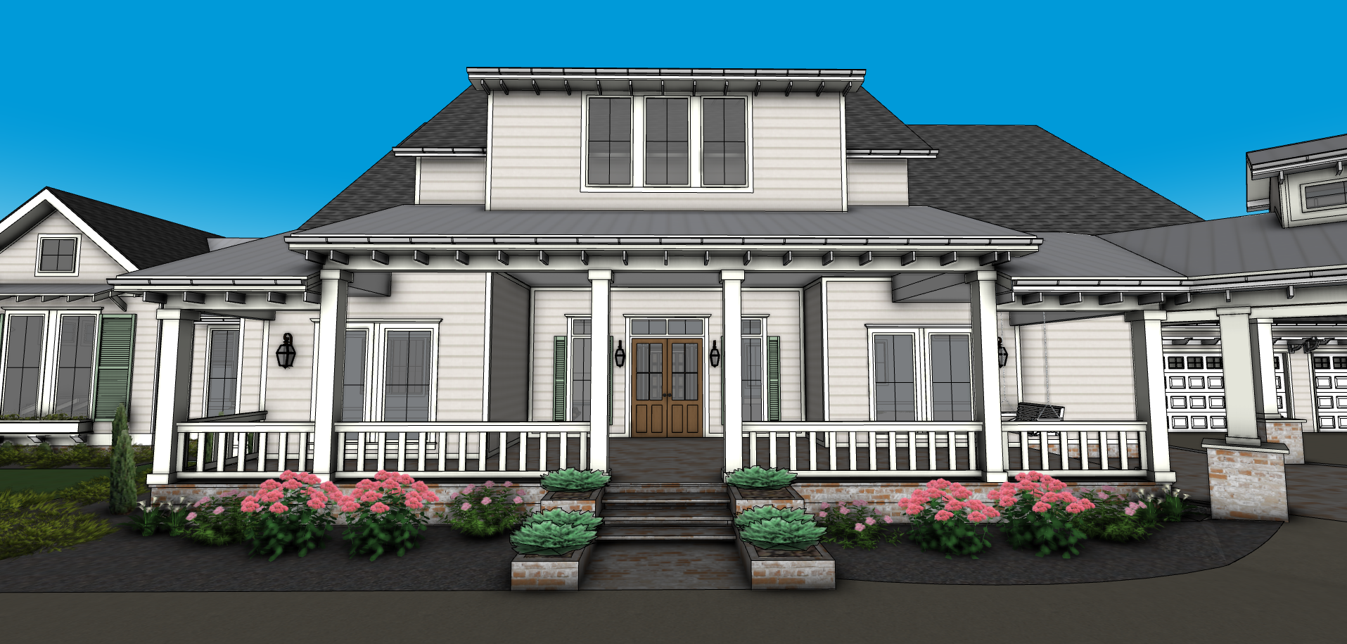 render a picturesque suburban house in a serene daylight setting the house features classic white siding with dark gray roofing surround the house with lush green grass and vibrant pink rose bushes along the path add charming green shutters on the windows for a pop of color the pathway leading to the house is smooth and dark gray enhancing the inviting atmosphere illuminate the scene with a clear blue sky creating a tranquil and welcoming ambiance