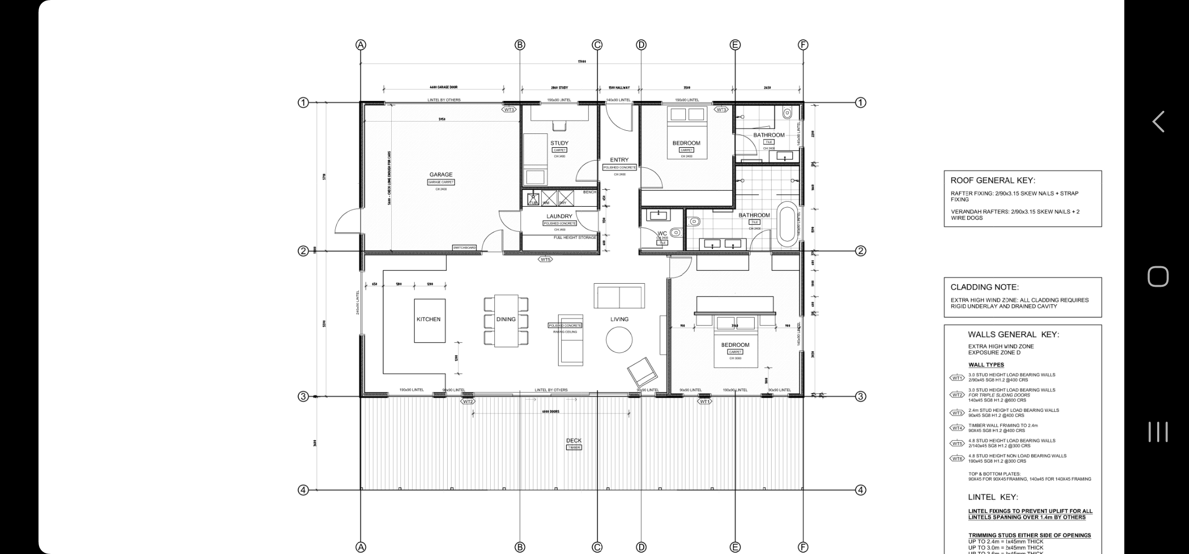 create a beautifully rendered architectural floor plan with the following elements 1 background soft white with a subtle textured finish to create an elegant base 2 walls crisp light gray with smooth textures to distinguish structural elements 3 doors and windows sleek jet black for contrast and definition 4 floors rich wood grain in warm oak tones for the living dining and kitchen areas 5 garage and laundry floors cool concrete gray for a modern clean look 6 bathrooms tile pattern in light blue gray for a fresh calming atmosphere 7 furniture neutral beige with soft fabric textures for a cozy feel 8 deck natural wood in a mid brown hue polished to highlight elegance 9 text and labels dark charcoal gray for readability and sophistication 10 overall atmosphere contemporary inviting and spacious with an emphasis on clean lines and an abundance of natural light