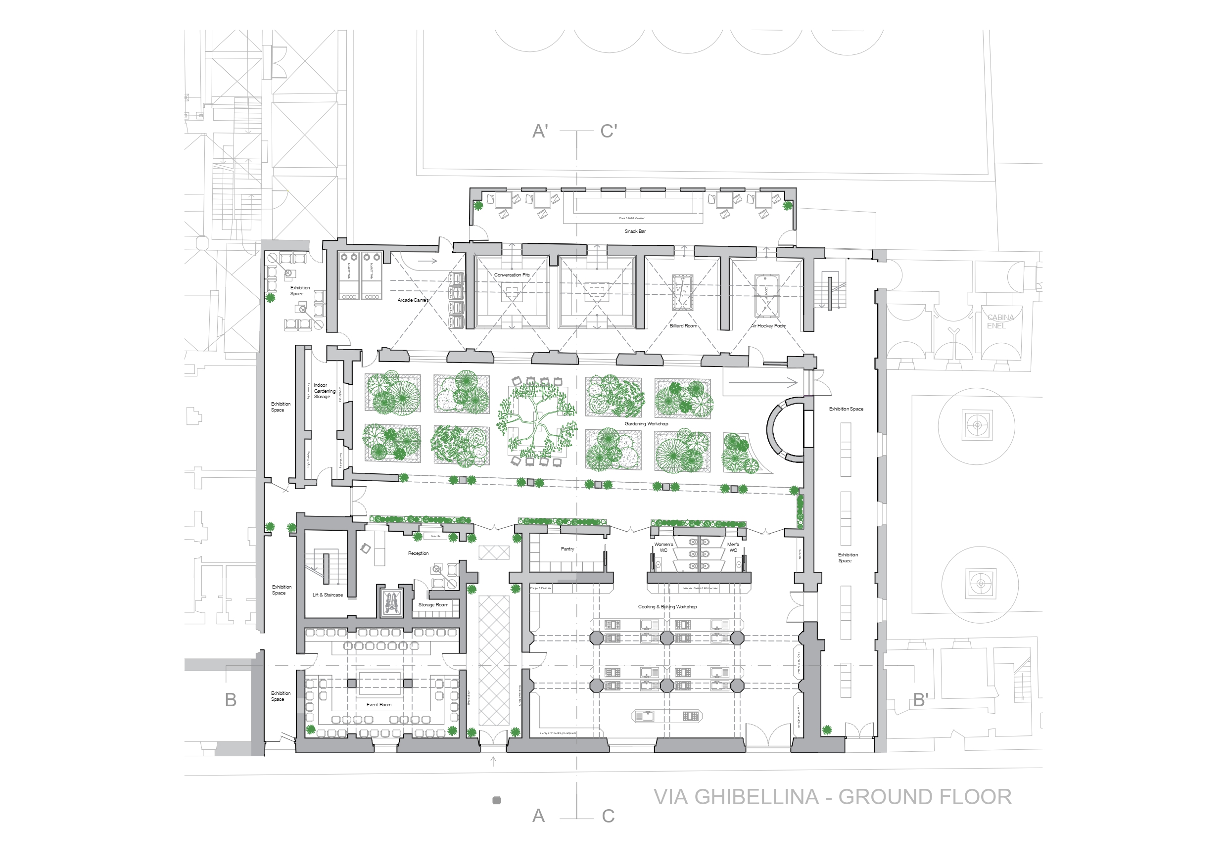 convert this floor plan into a realistic isometric 3d view of a full house show the space from an elevated angle with furniture walls and details visible create a clean isometric interior render from the plan of a community focused adult social hub in a historic building combining structured geometry with soft organic forms inspired by honeycomb and natural patterns use warm neutral tones beige terracotta soft greens and natural materials like wood fabric and light stone include contemporary modular furniture with rounded edges such as lounge seating communal tables and conversation pits apply soft warm diffused lighting with subtle feature pendants keep spaces visually open with light or transparent partitions highlight workshops social areas and caf zones style should be architectural slightly stylised with soft shadows and minimal human figures to suggest activity use the same furniture as shows on the plan do not change the orientation of the floorplan