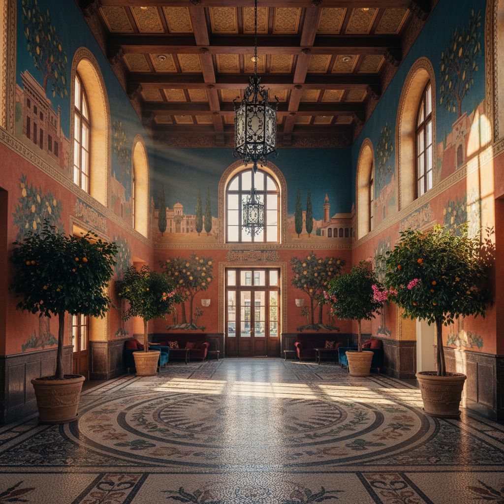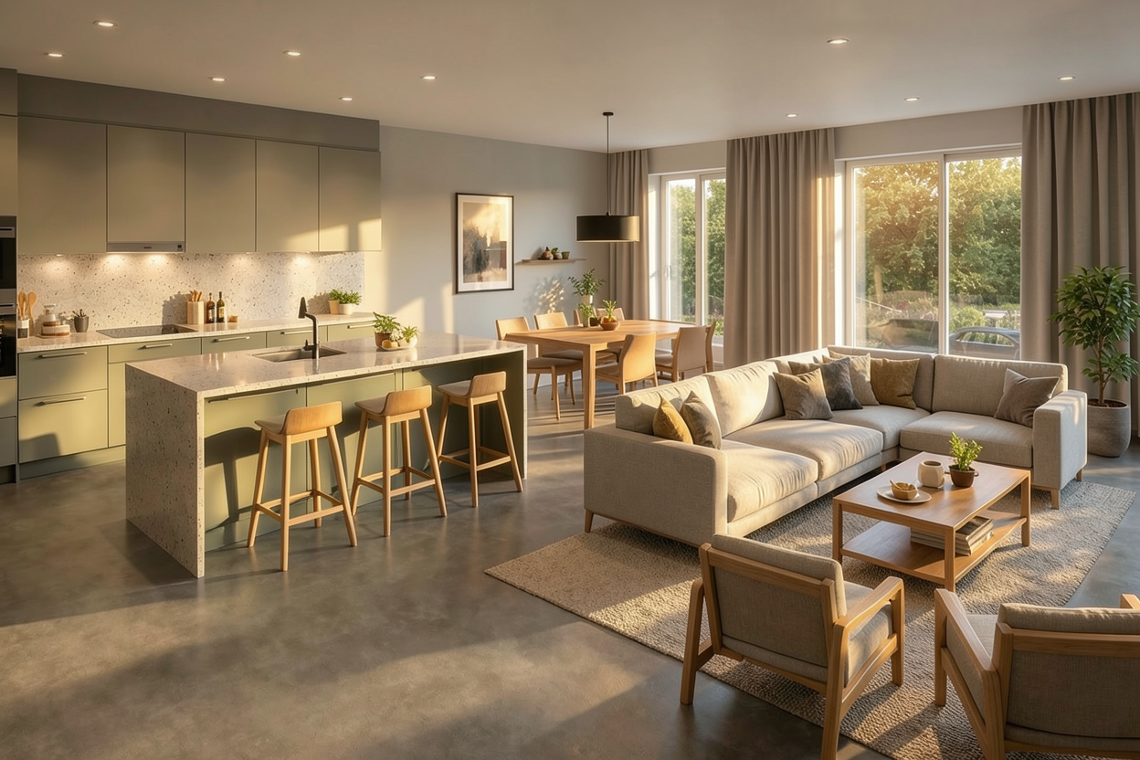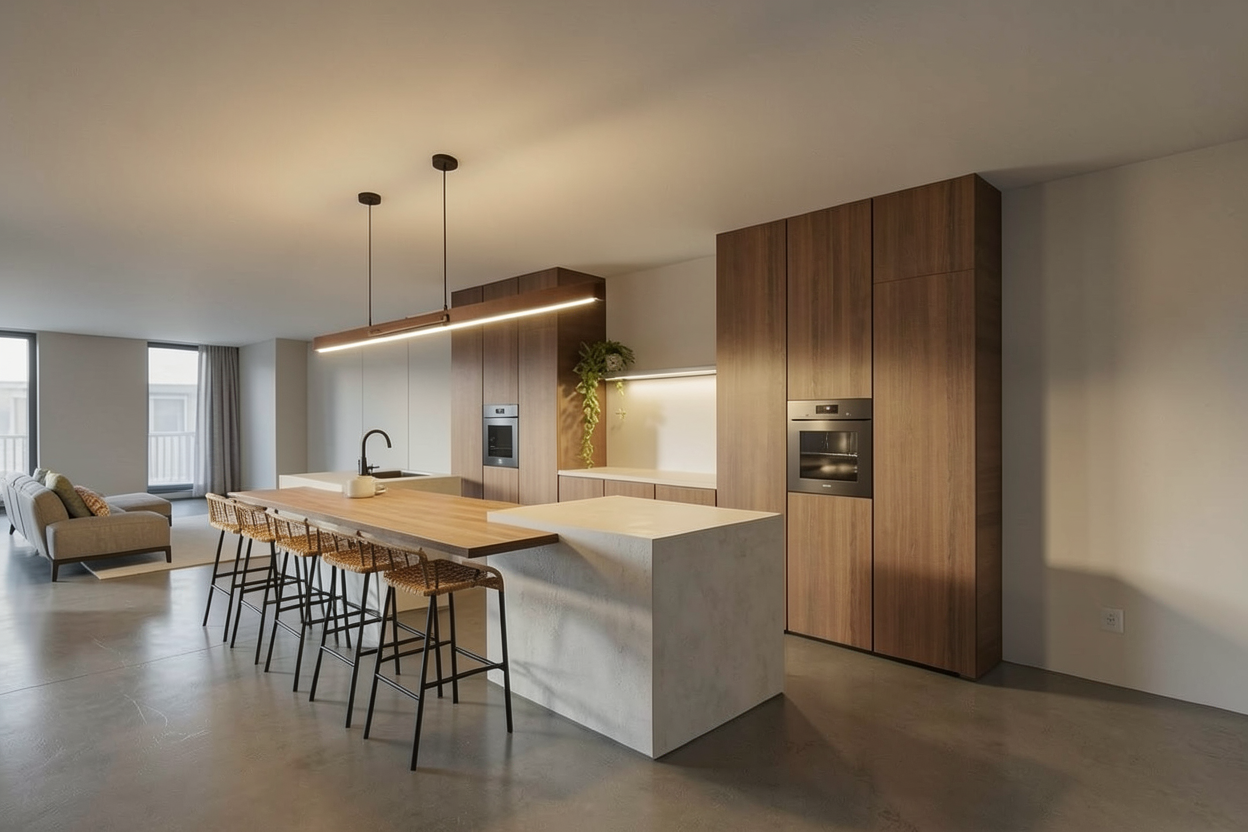make a photorealistic render wtihout changing the perspectif keep the materials close to the original and put a hanging horizontal ligth the flos belt leather above the kitchenisland no added windows or doors make the picture overal light just at 12 00