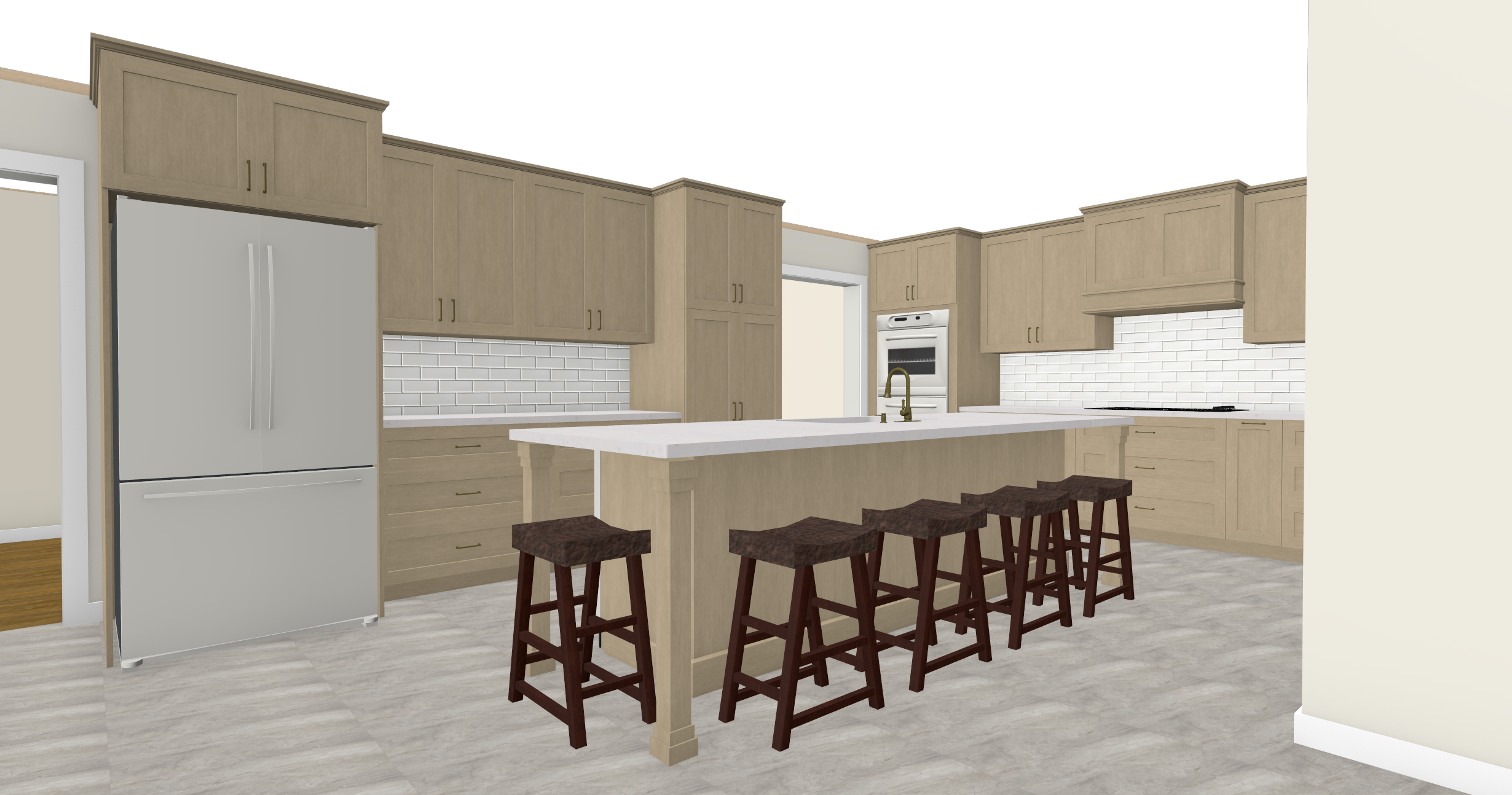 a modern kitchen with blonde maple cabinets grey 12x24 tile floor but then hardwood at the doorways to the back room the ceiling is an 8 flat white ceiling add two pendants over the island architecture