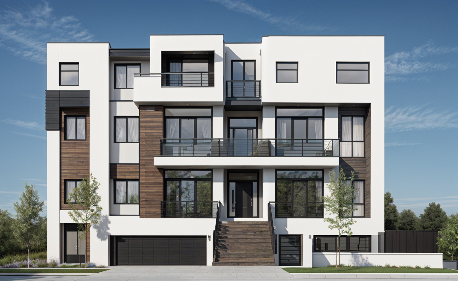 prairie style texas ranch land setting with foundation planting and wildflowers brown roman brick with cream color stucco band above no brick above windows cherokee red paint on doors windows fascia texas live oak trees in yard taper walk up to front porch gravel drive to garage door winter snow interior lights on