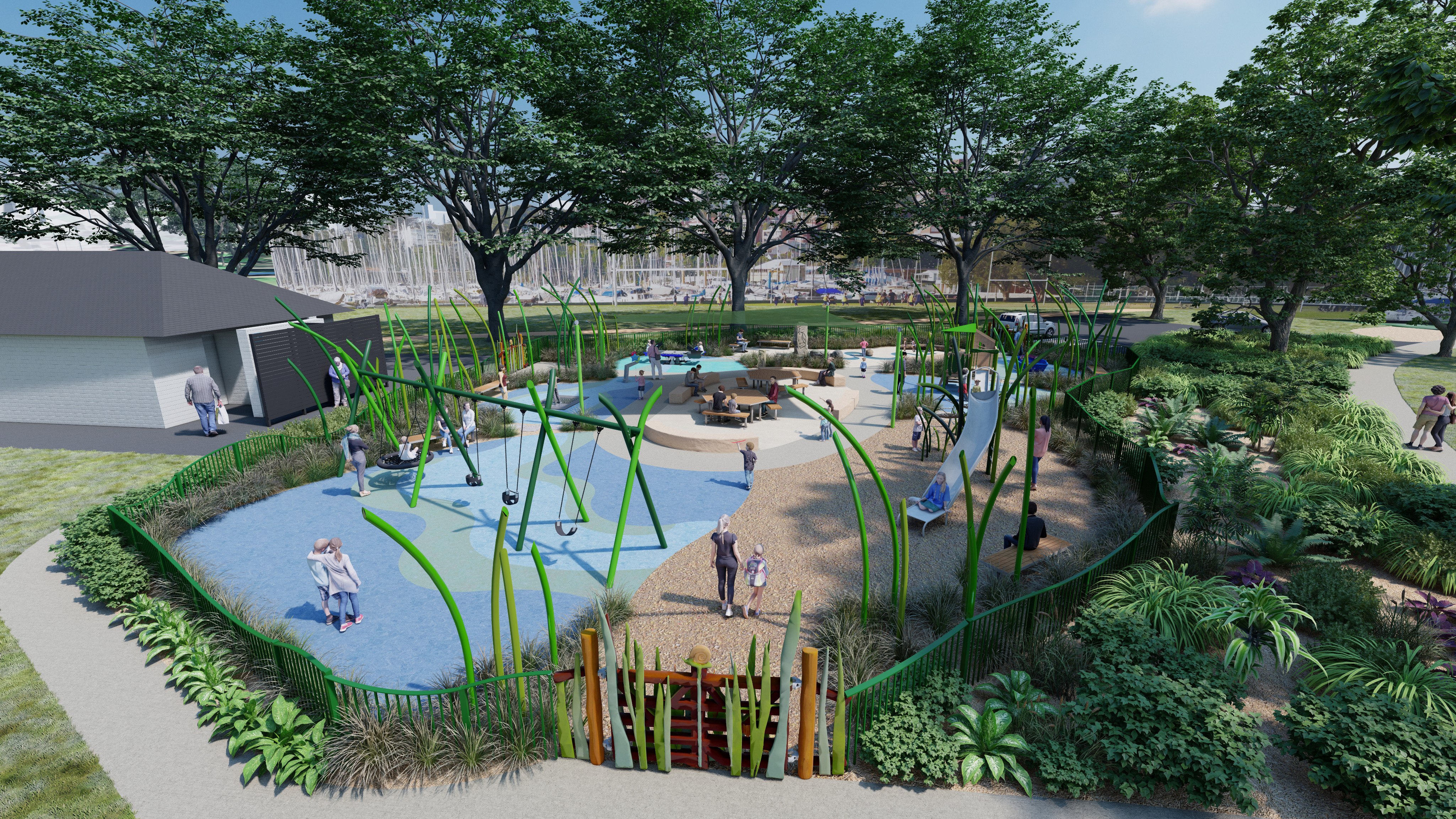 keep everything the same just add small kids on swing and adult pushing them all people back to camera