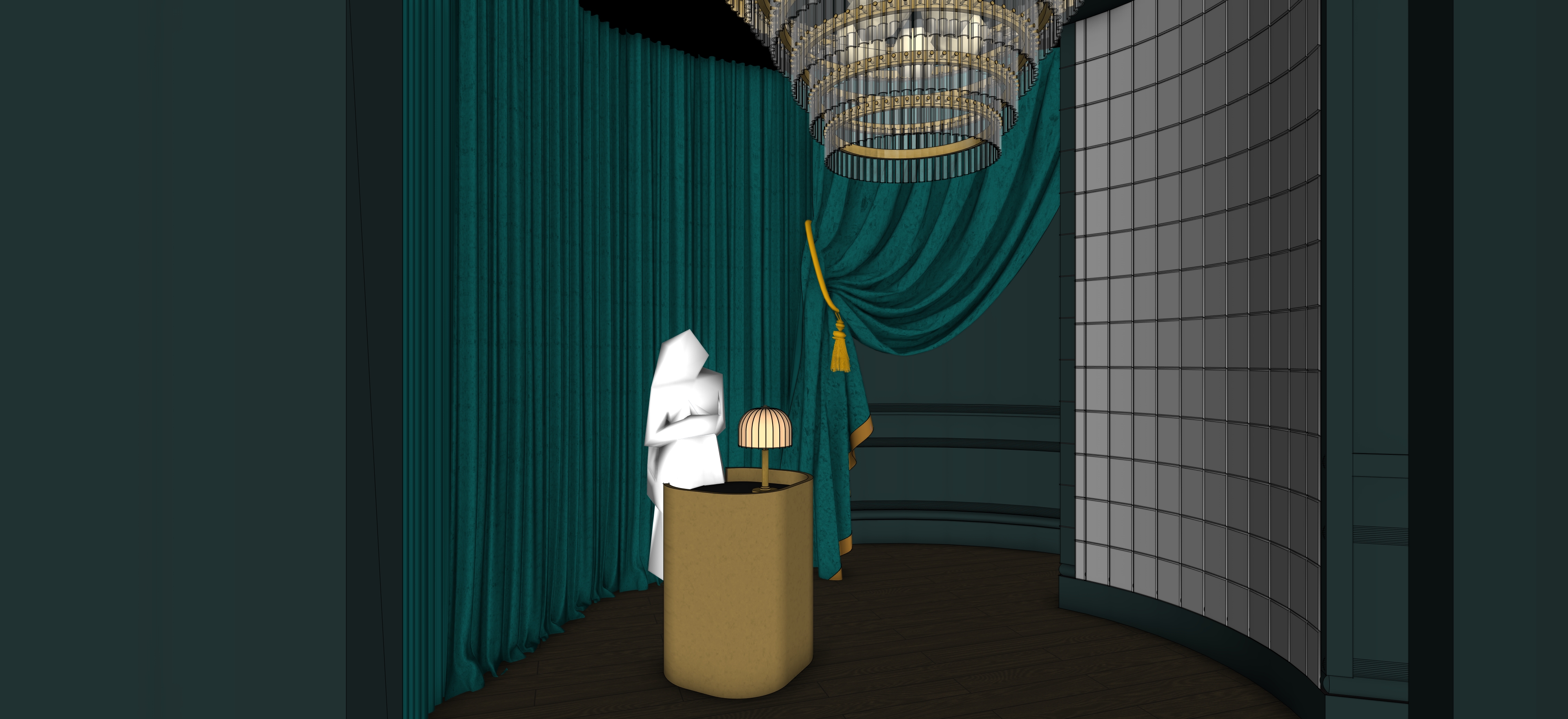 can you take this sketchup export and render it like an enscape interior design rendering of a very dark and moody bar and lounge at night remove the white blob people dial up the saturation this should read like a vip entrance rotunda
