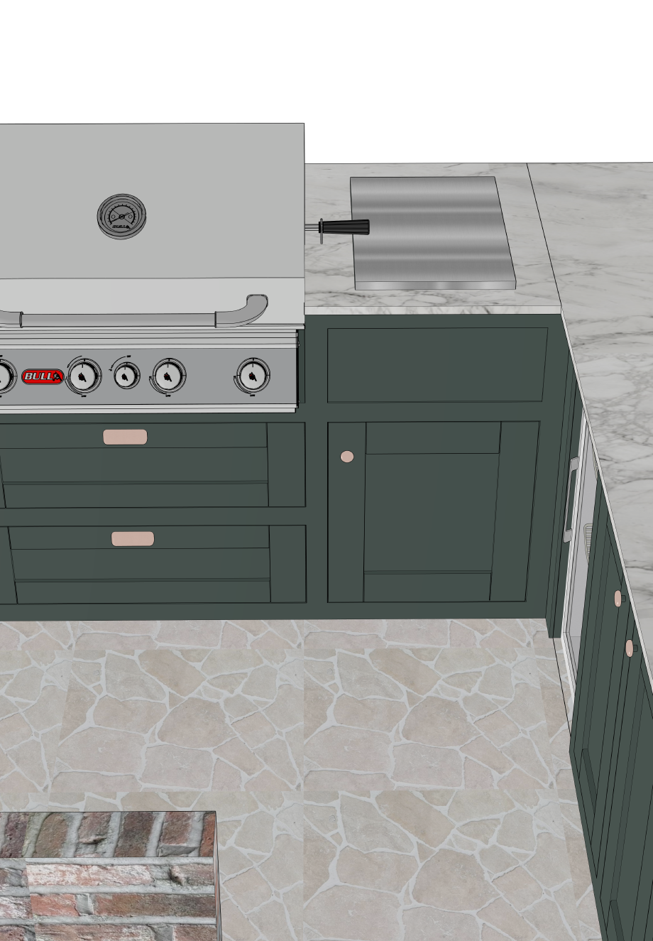 remove the wood effect from the cabinets and instead have a powder coated texture the colour of the cabinets needs to be neptune charcoal can there be grass behind the view