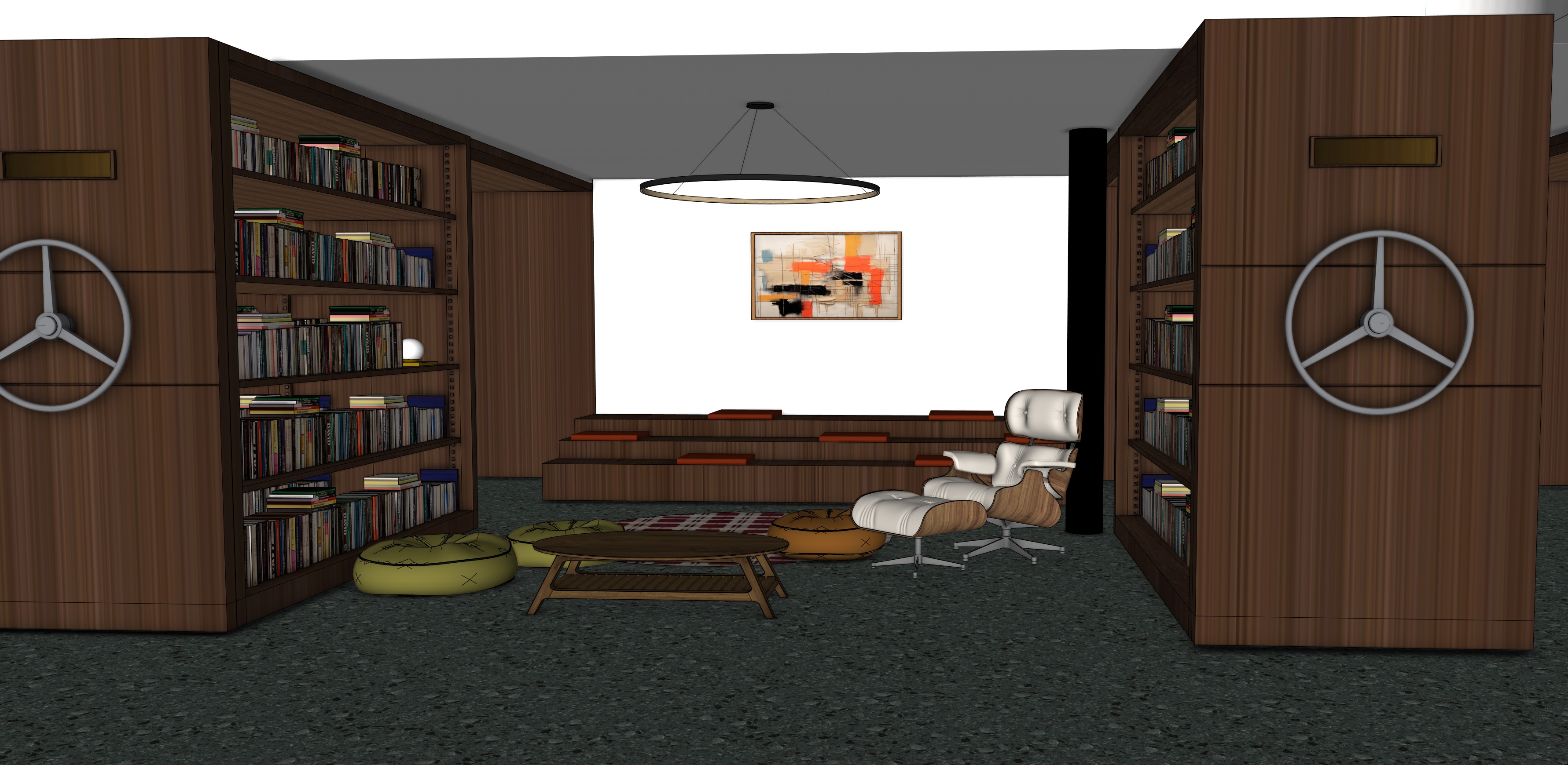 modernist exterior shot photorealistic architectural visualization of a coworking and coliving reading area in barcelona contemporary mediterranean interior with warm walnut wood bookshelves and stepped seating platform agora floor material is continuous green terrazzo flooring realistic terrazzo texture with visible stone aggregates polished finish deep green tone consistent across entire space no rug or carpet natural daylight is the main light source entering softly from adjacent spaces creating balanced and neutral illumination realistic daytime lighting calm and welcoming atmosphere integrated bookshelf lighting is subtle and low intensity 3000k soft accent lighting only not dominant the stepped seating platform has no back wall lighting the vertical wall behind seating is clean and evenly lit add recessed ceiling spotlights minimal and flush with ceiling soft neutral warm light 3000k low intensity realistic architectural lighting add a few people naturally reading and relaxing calm coworking atmosphere highly realistic materials walnut wood green terrazzo flooring matte finishes soft shadows global illumination editorial architectural photography style dezeen and archdaily aesthetic architecture